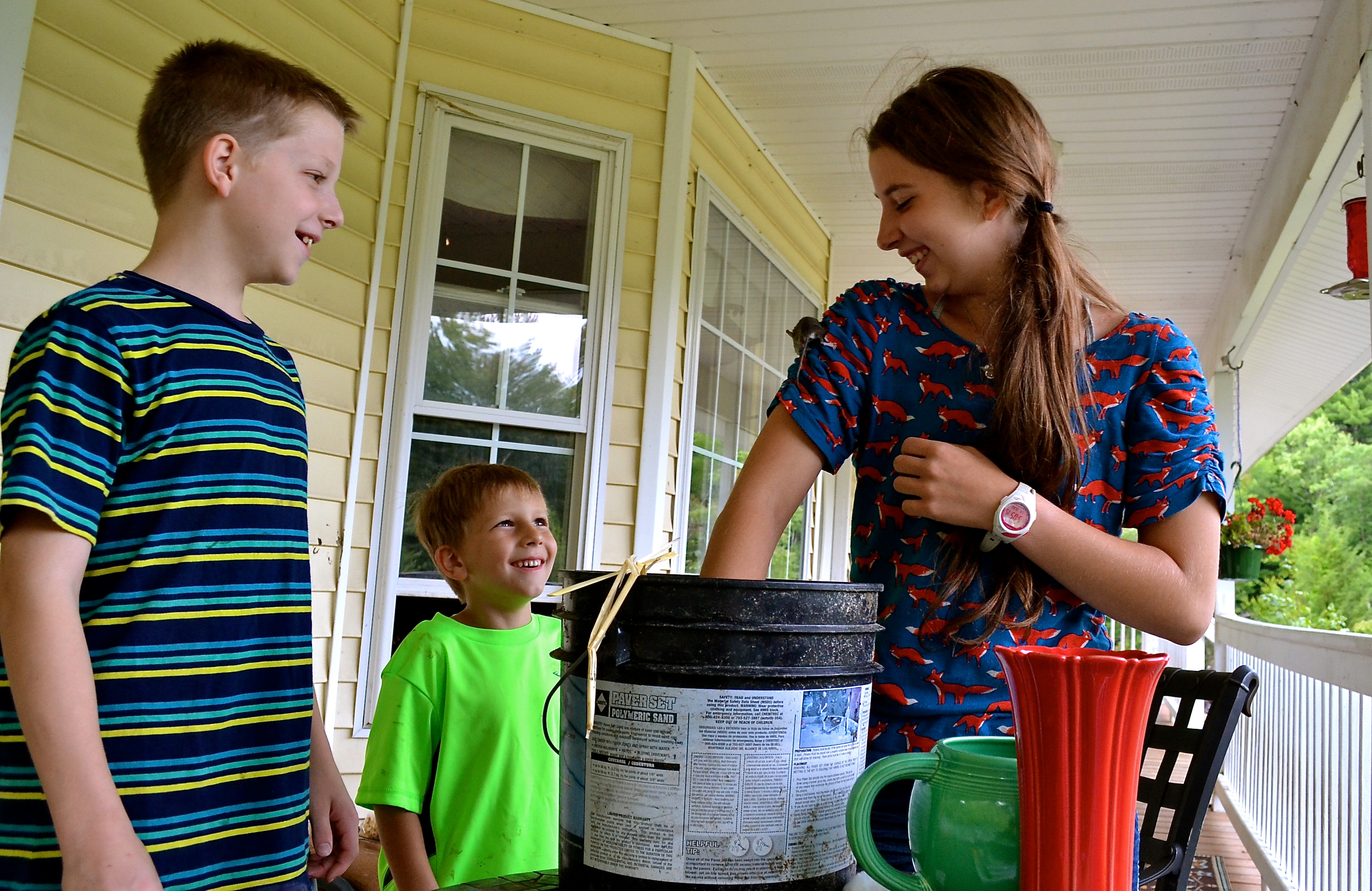 I was, like I mentioned, sitting on the porch looking up recipes for green bean side dishes…..when superhero David rescued an adorable deer mouth from the jaws of death.  He promptly put it in a bucket and gave it a cheerio.  Seth was an onlooker, looking but not touching, but then when big sister arrived on the scene, she promptly named him TIMMY and picked him up!