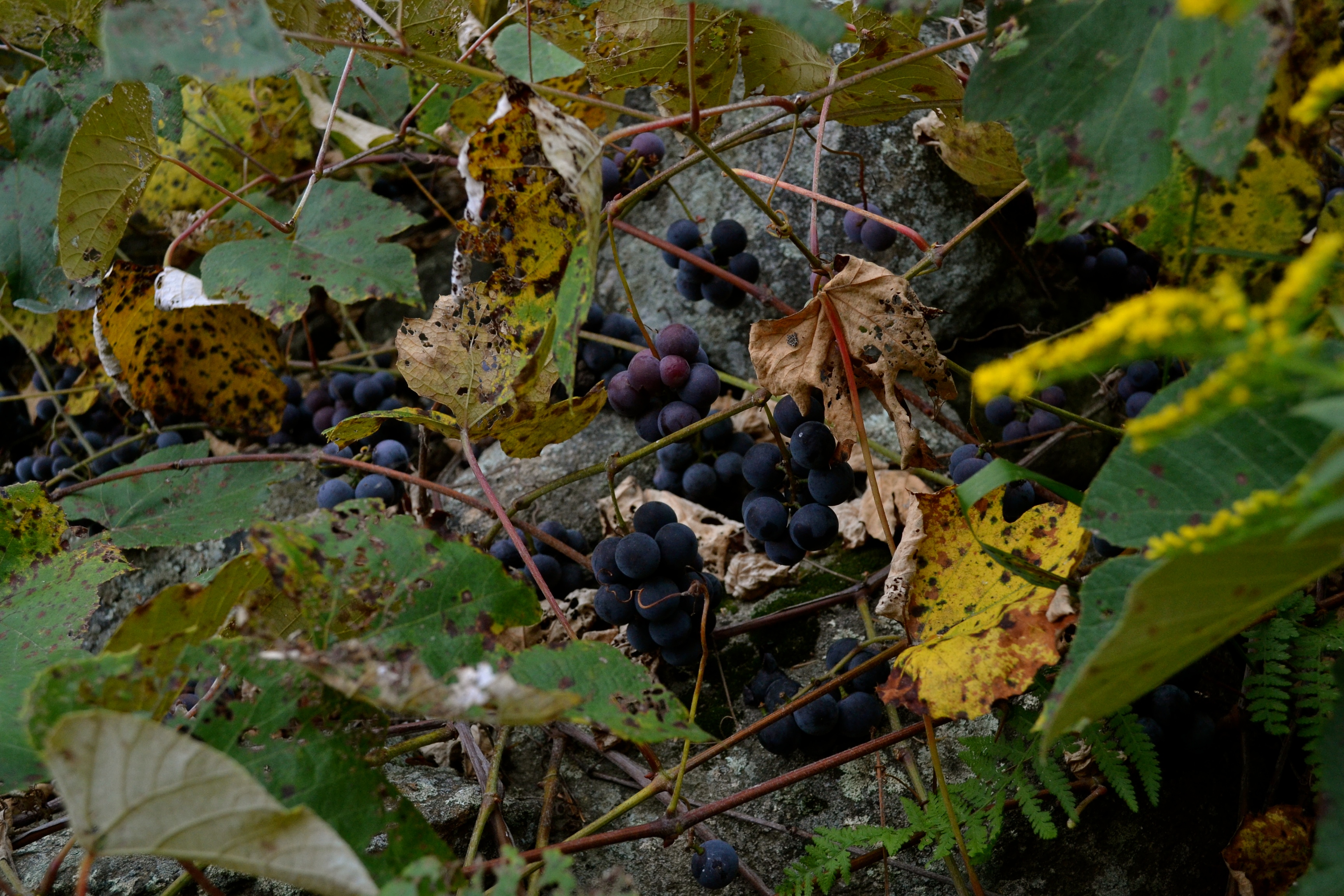He took a plastic bag in order to collect wild concord grapes.  They were sour; our walk was punctuated by the sound of him vigorously spitting them back out…….I politely refused his generous offers of grapes from the bag.