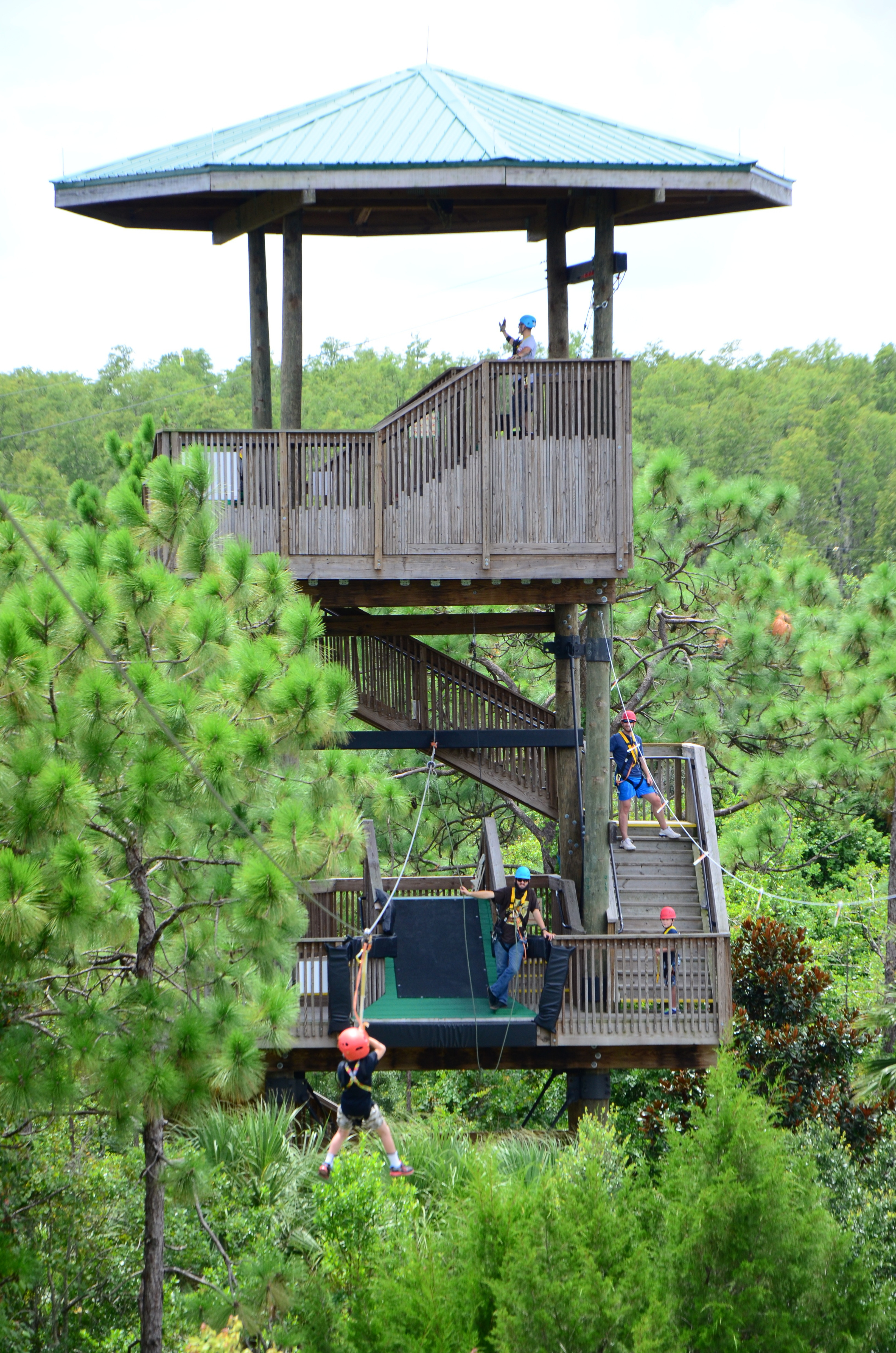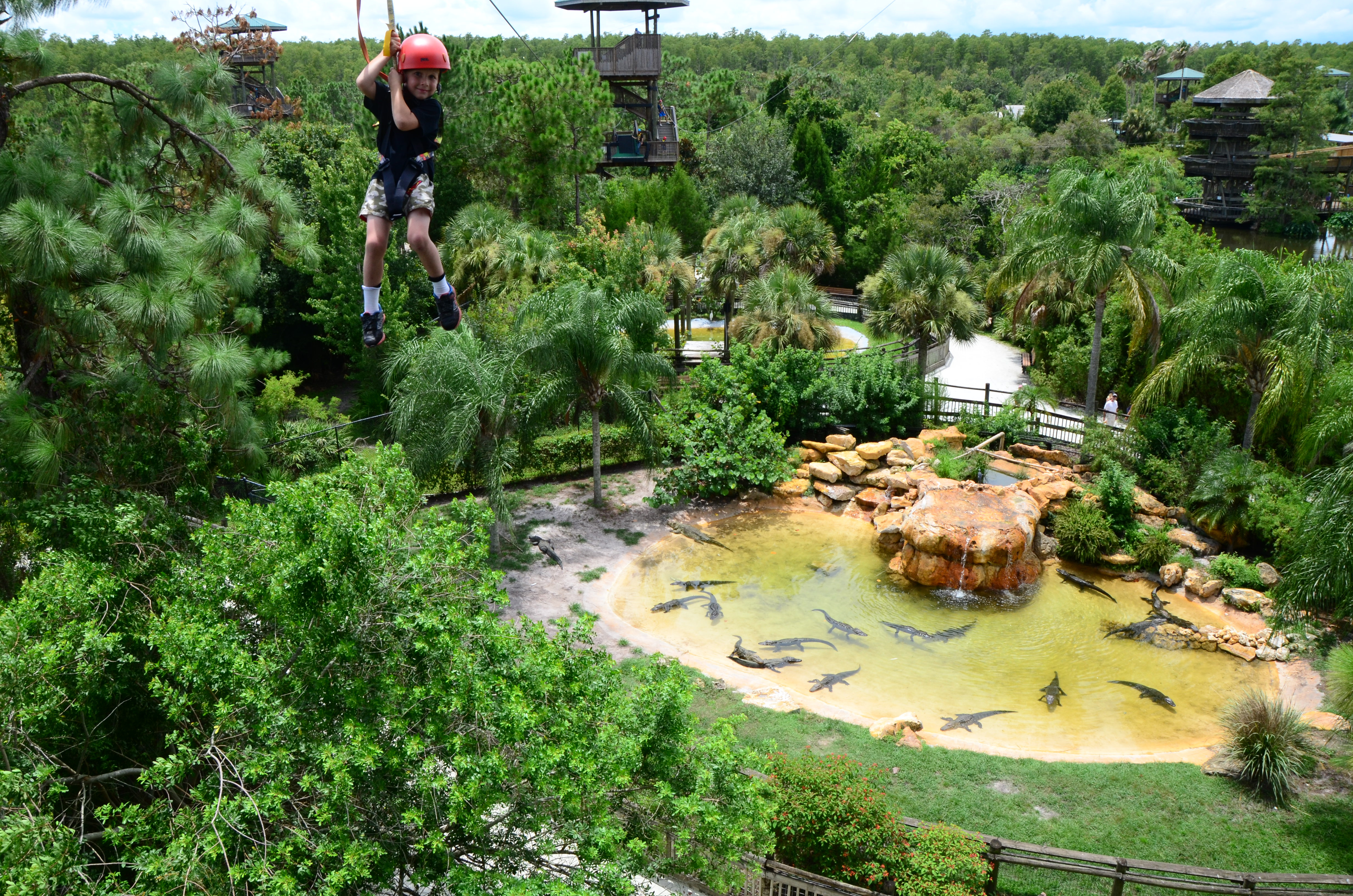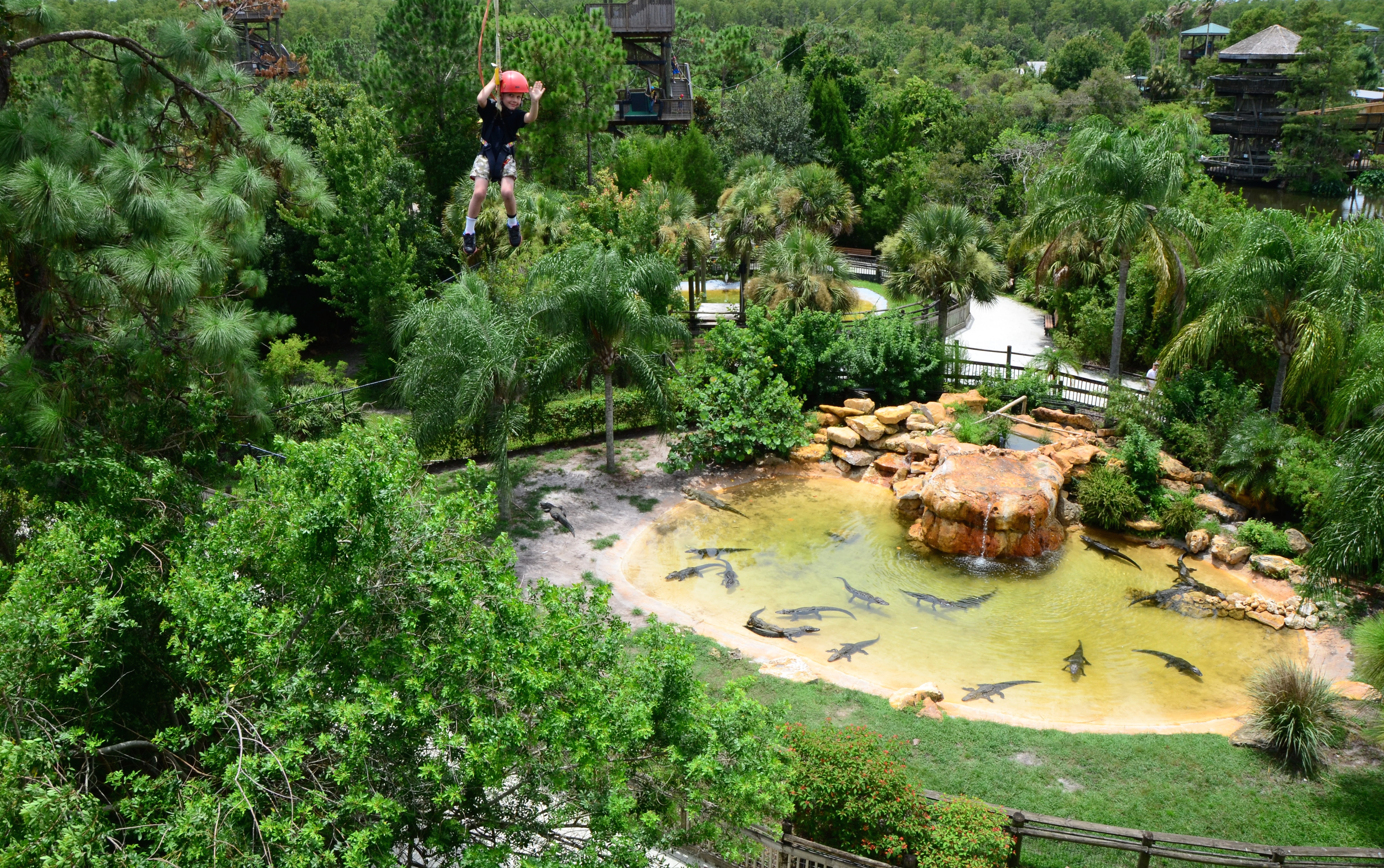 “Clip in and ‘zip’ off on an exciting outdoor adventure with the all-new Screamin’ Gator Zip Line at Gatorland  Your journey will take you along 1,200 feet of high flying, heart pounding adventure from some of the finest zip line towers in the world.  Standing over seven stories tall, these amazing towers feature multilevel launch pads and breathtaking views from high above the treetops.”  ~from the brochure