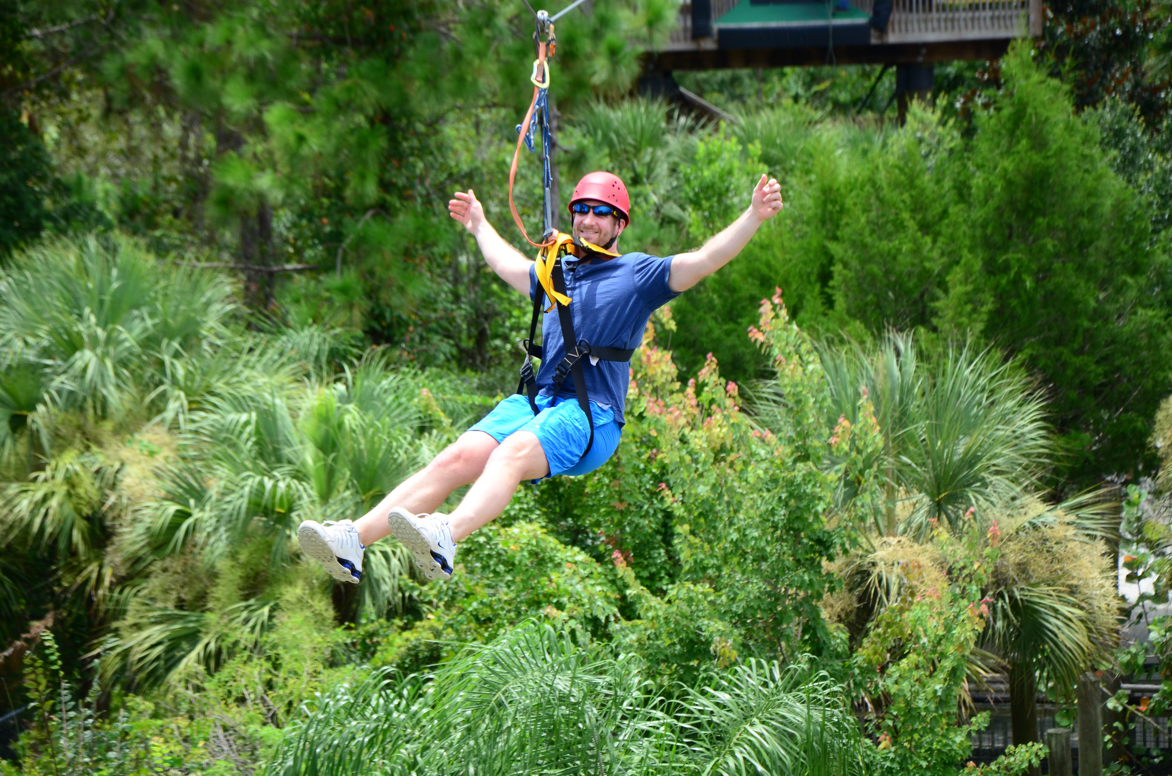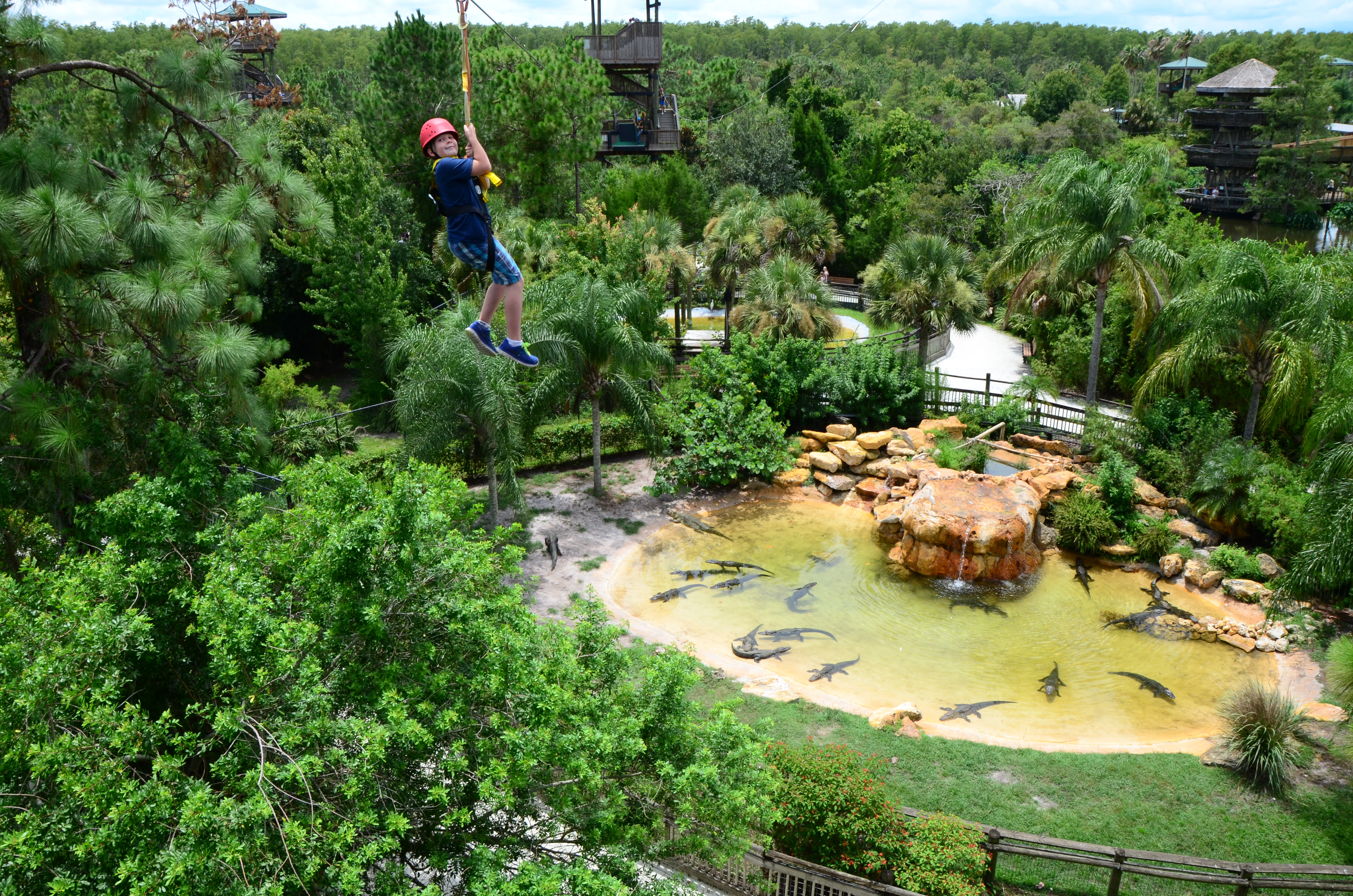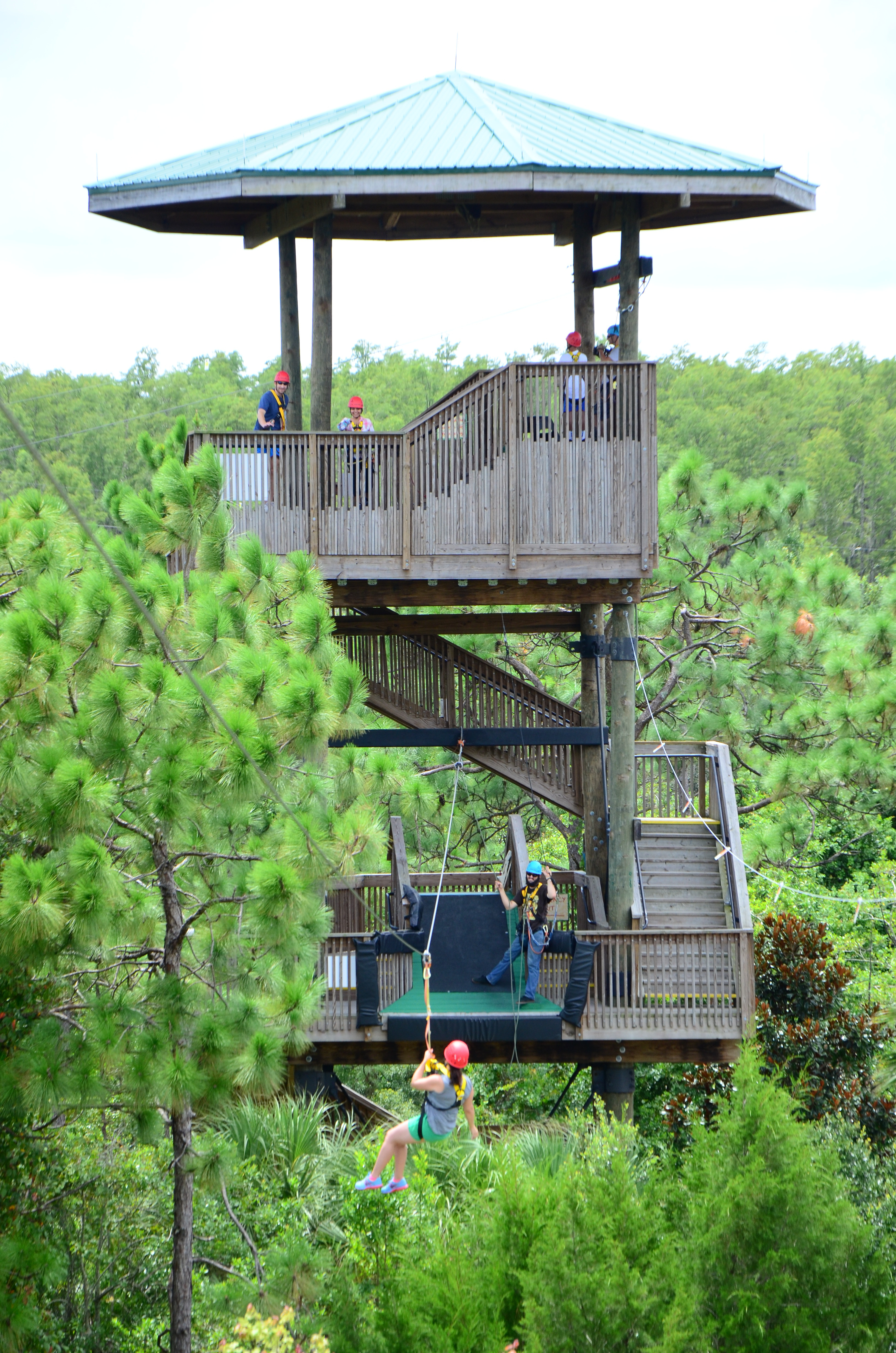 “Clip in and ‘zip’ off on an exciting outdoor adventure with the all-new Screamin’ Gator Zip Line at Gatorland  Your journey will take you along 1,200 feet of high flying, heart pounding adventure from some of the finest zip line towers in the world.  Standing over seven stories tall, these amazing towers feature multilevel launch pads and breathtaking views from high above the treetops.”  ~from the brochure