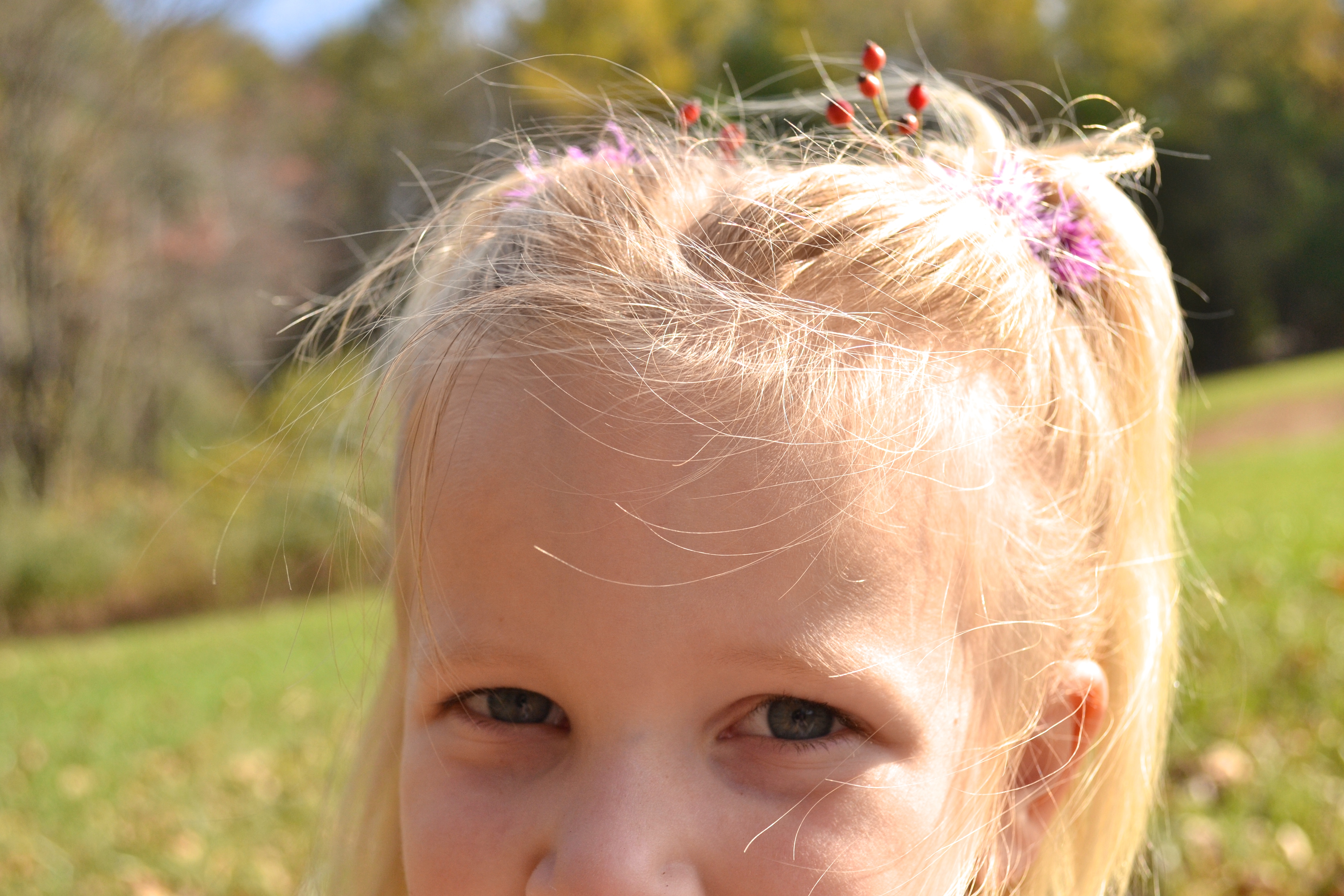 I tucked purple wild flowers and rose hips into Sarah’s ponytails.