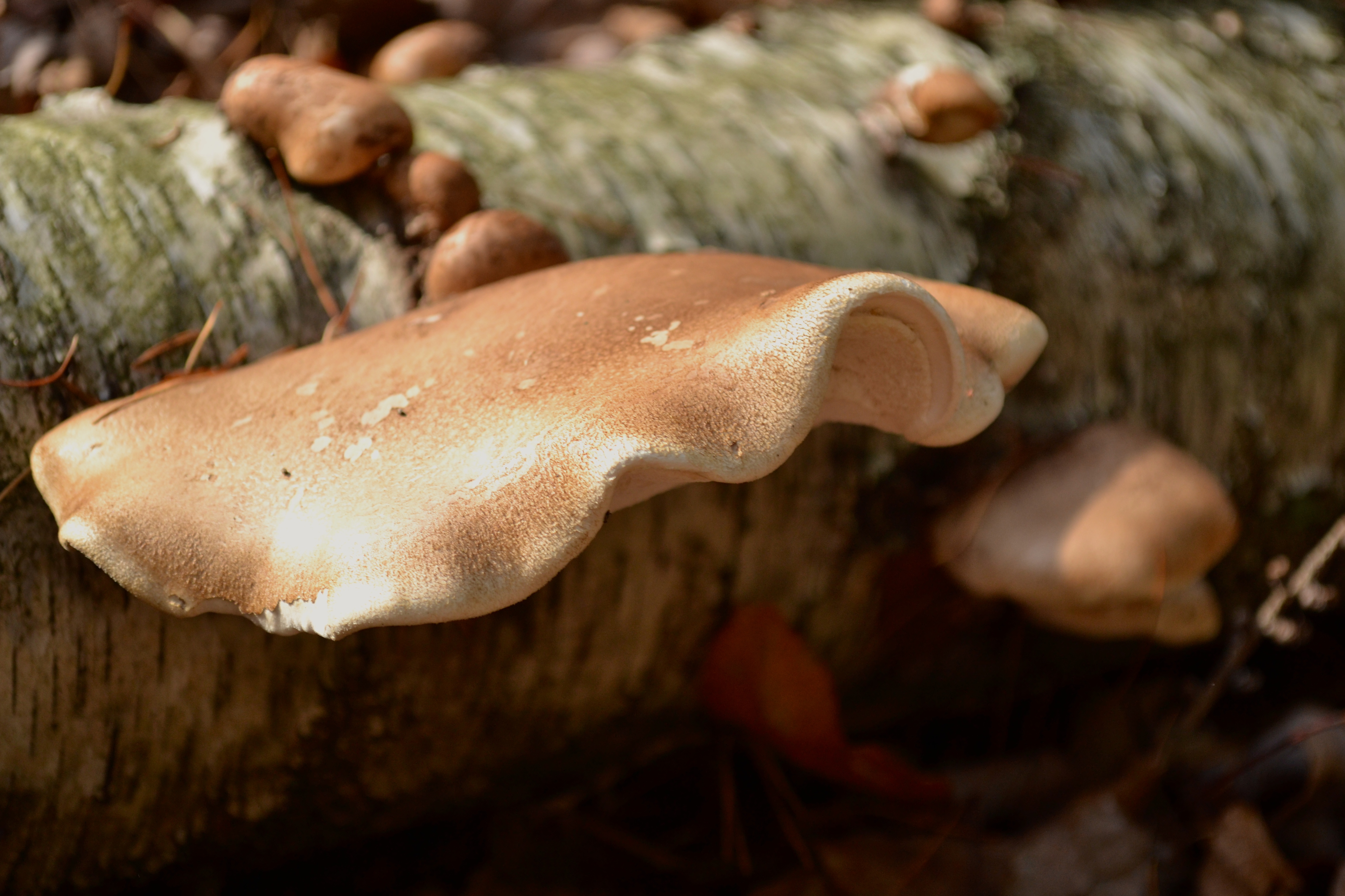 These three mushrooms were growing up from behind tree bark; bark which was hanging off an old fallen down log.