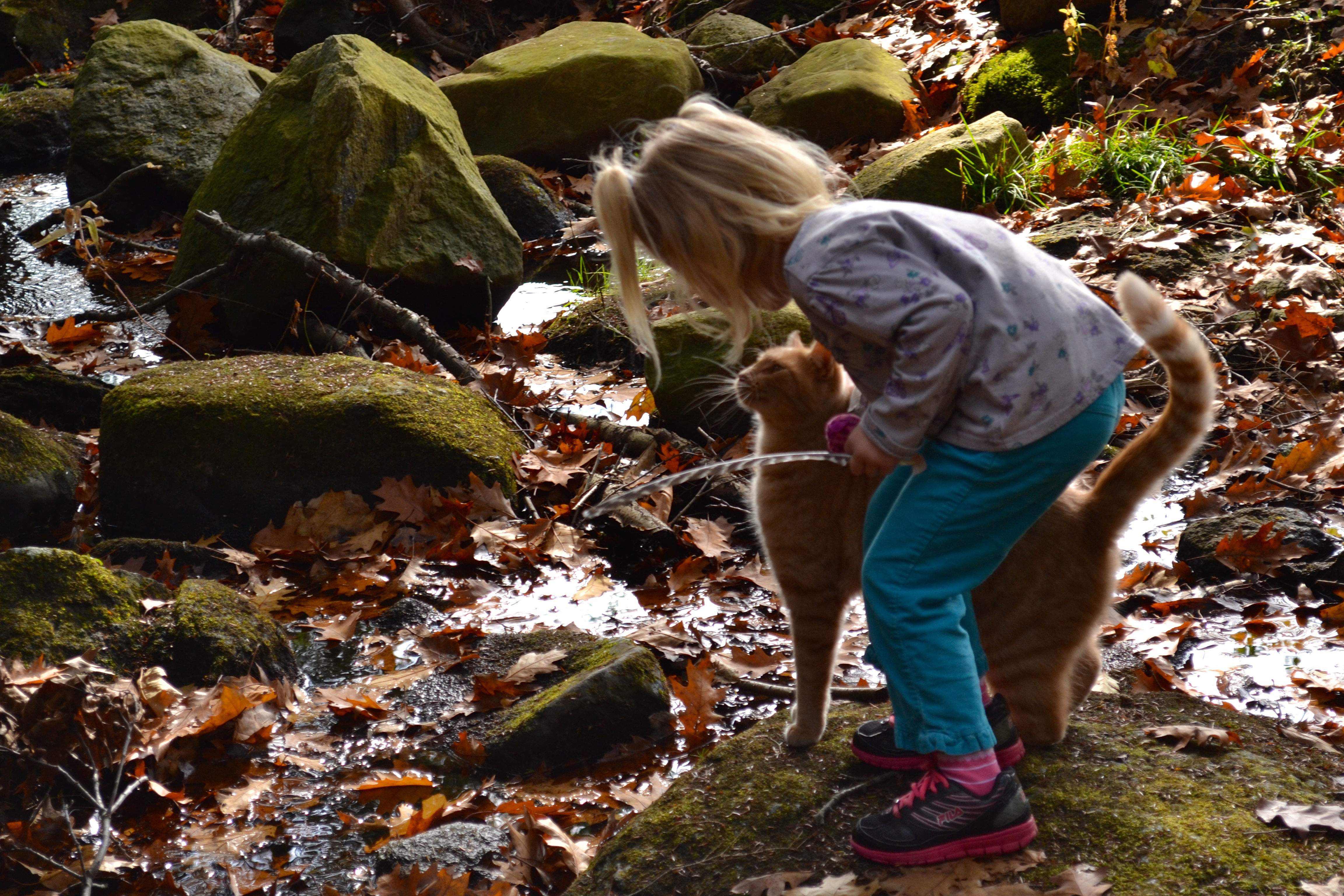 We made our way back home by going down the trail a little ways and then through the woods to cross our stream onto our own property. On our way across, we saw a dear dear friend. I took pictures of Sarah’s face as she cooed motherly greetings at him……..
