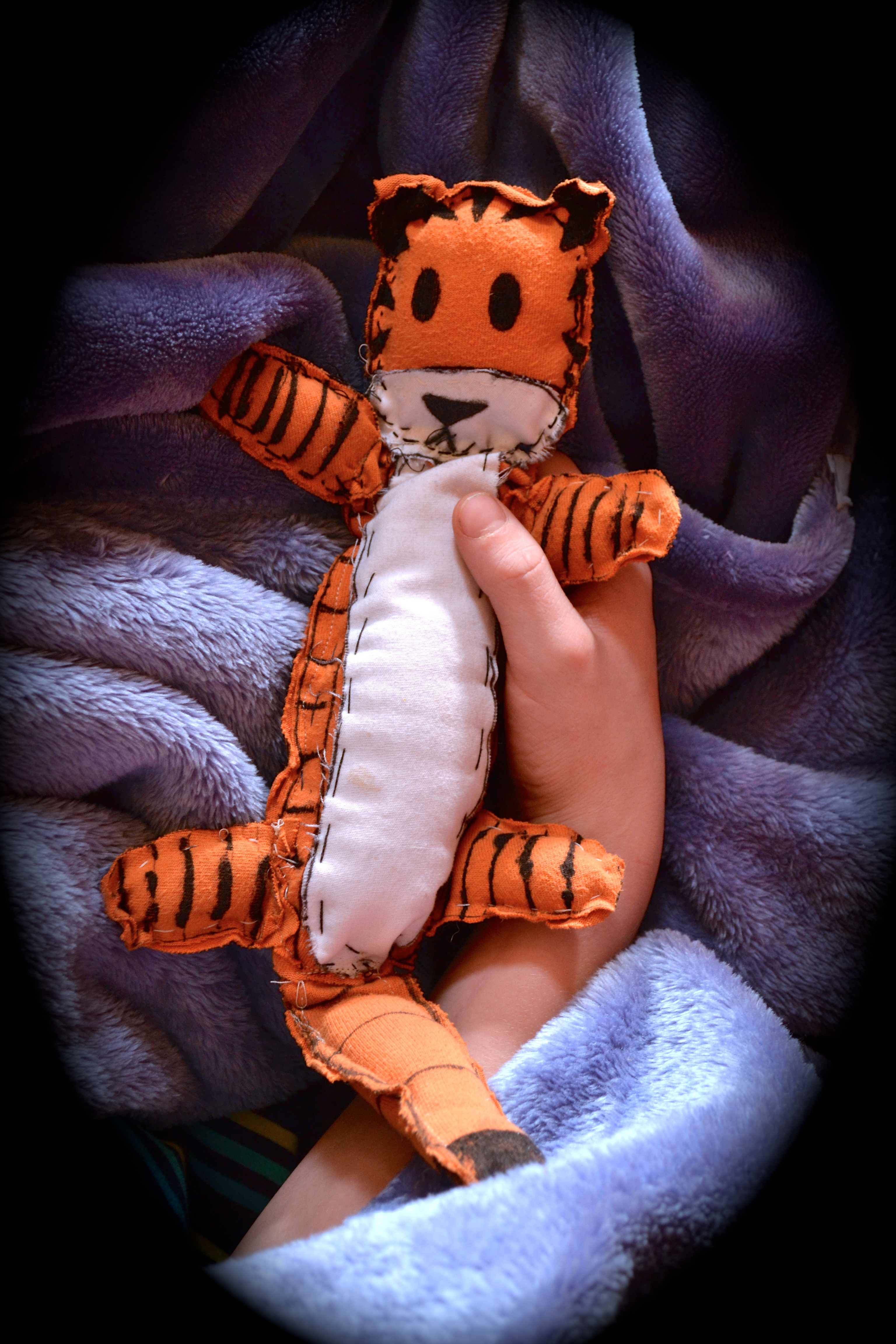 This is a blog post about a handmade orange Hobbes.  My boys love to read Calvin and Hobbes comic books and David especially has such a fondness for them.  After reading the comic books for a while, David thought he would make himself a Hobbes.  He didn’t think about trying to purchase one, because he watched a documentary about Calvin and Hobbes and learned that Bill Watterson didn’t want companies making Hobbes or other merchandise that goes along with the comic.  “I made Calvin and Hobbes as a comic strip.  That’s all I want them to be.”  David knew if he wanted a Hobbes he had to make one himself.