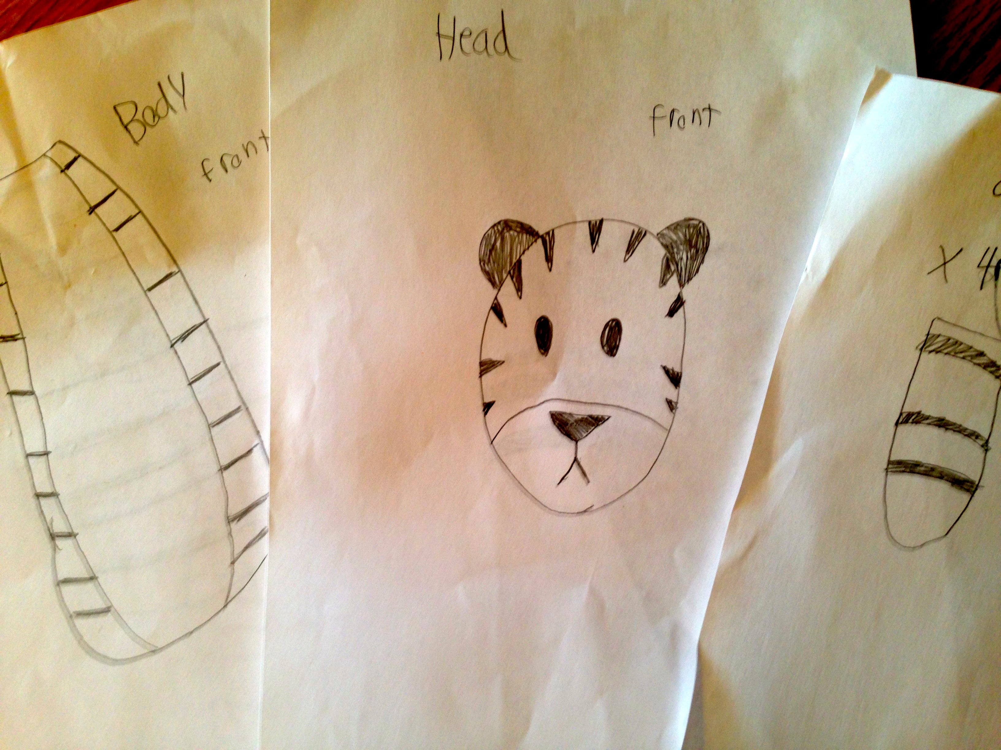 After drawing his pattern, he set to work.  He had help in threading the needles and taking out knots.  He used a black sharpie to give Hobbes his stripes and then took a break to scrub ink off the wooden floor in the master bedroom, where he worked.  He had various other problems, and even put Hobbes aside for a month or so, but eventually completed him last week.  He had him on his shoulder for a day and then unfortunately his little brother somehow ended up with him.  When David finally found him, to his horror Hobbes’ arm was hanging off by a long string and a seam had opened, exposing stuffing.  He was tempted to throw Hobbes away but put him back on the sewing table instead, to work on after his emotions cooled.
