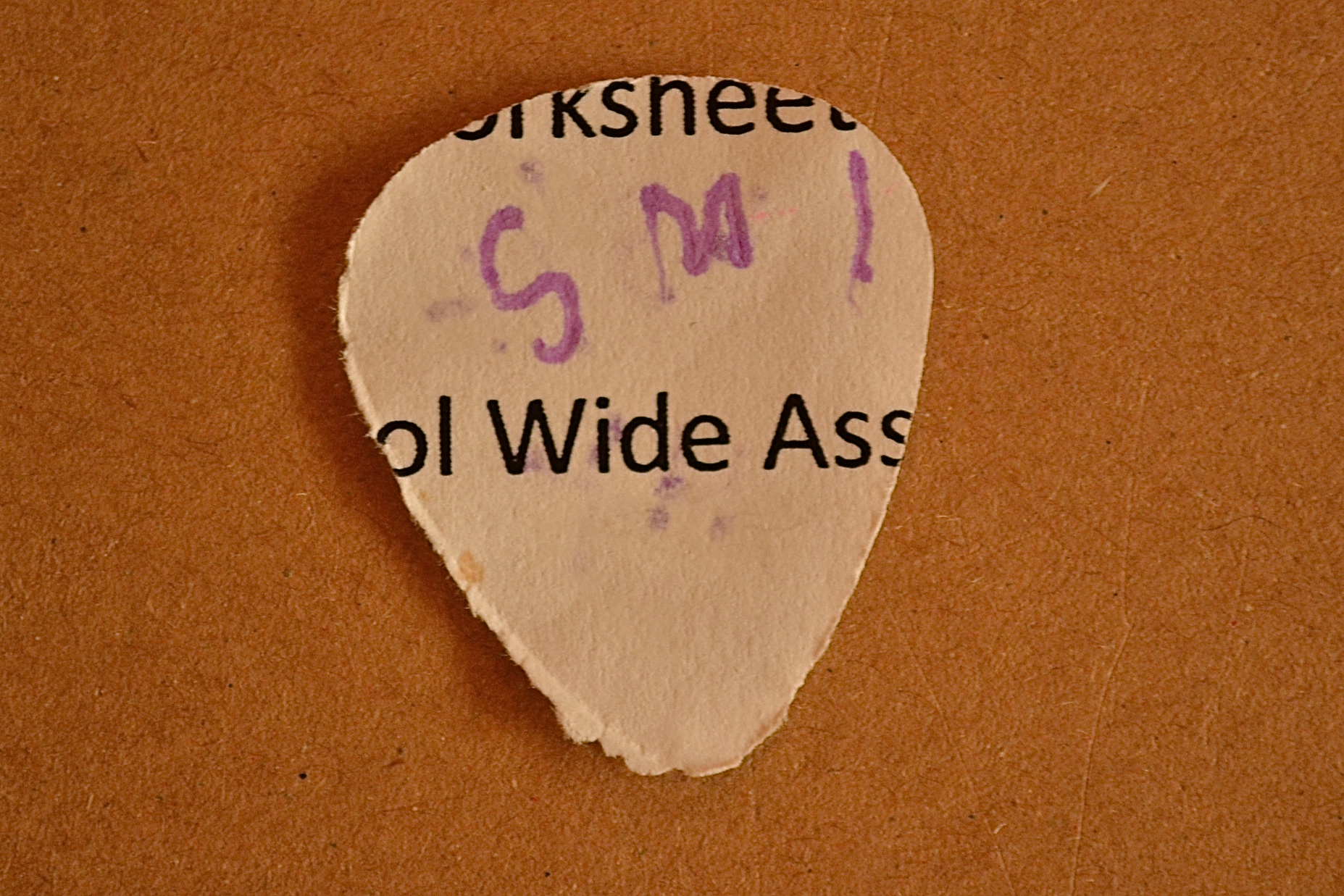 Yesterday evening four year old Sarah sat at the dining room table all by herself.  She was busy with a guitar pick maker that was given to Ethan a few years ago.  The pick-maker is a hole punch that makes a single guitar pick out of old credit cards, thick plastic, and what have you.  She was having a lovely time going around and around several pieces of scrap paper with it.   She ended up making about 50 guitar picks, all from paper.  She carefully wrote on some and decorated others.