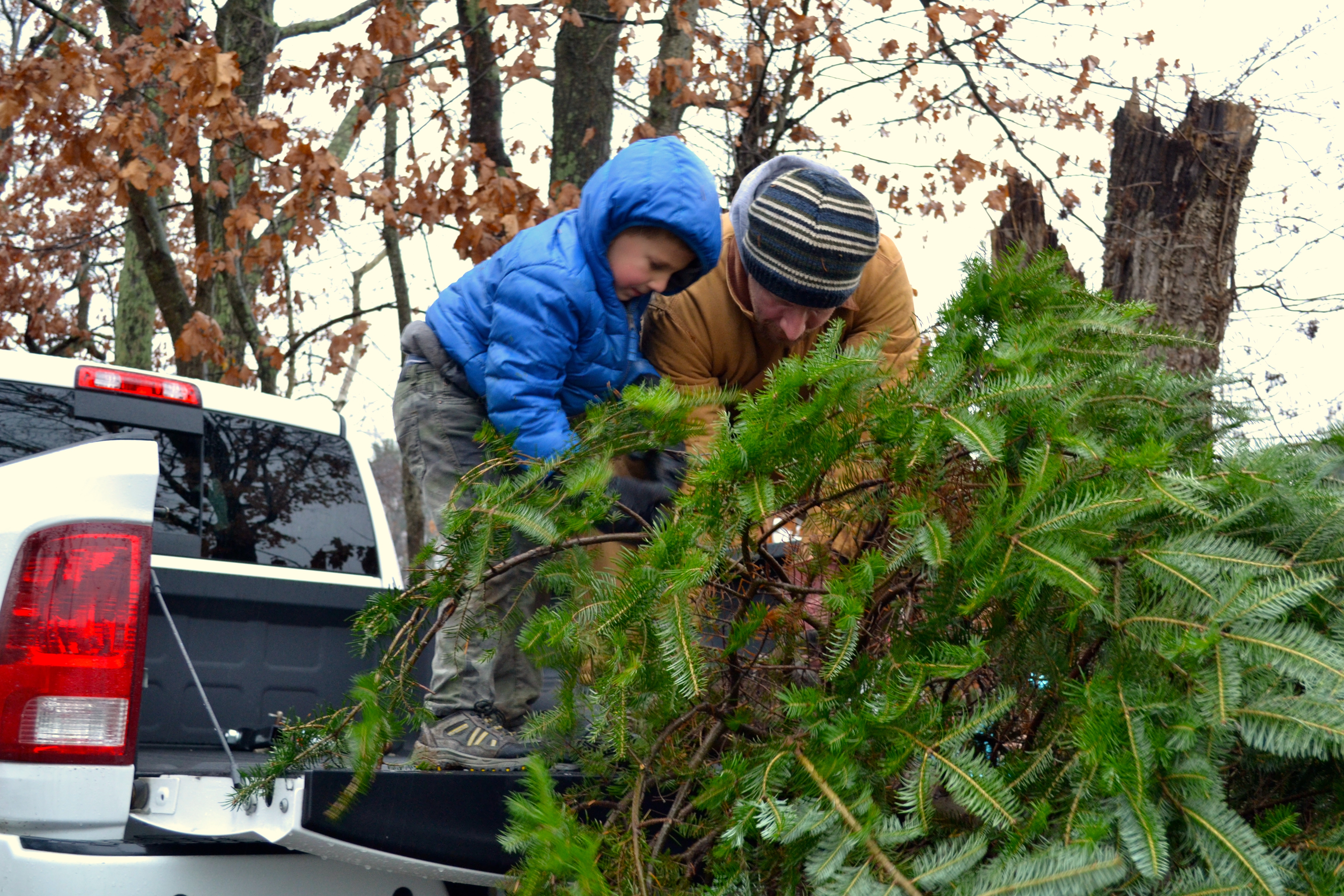 Seth, ready to be a help, climbed up on the truck to pull the tree up with his Dad.