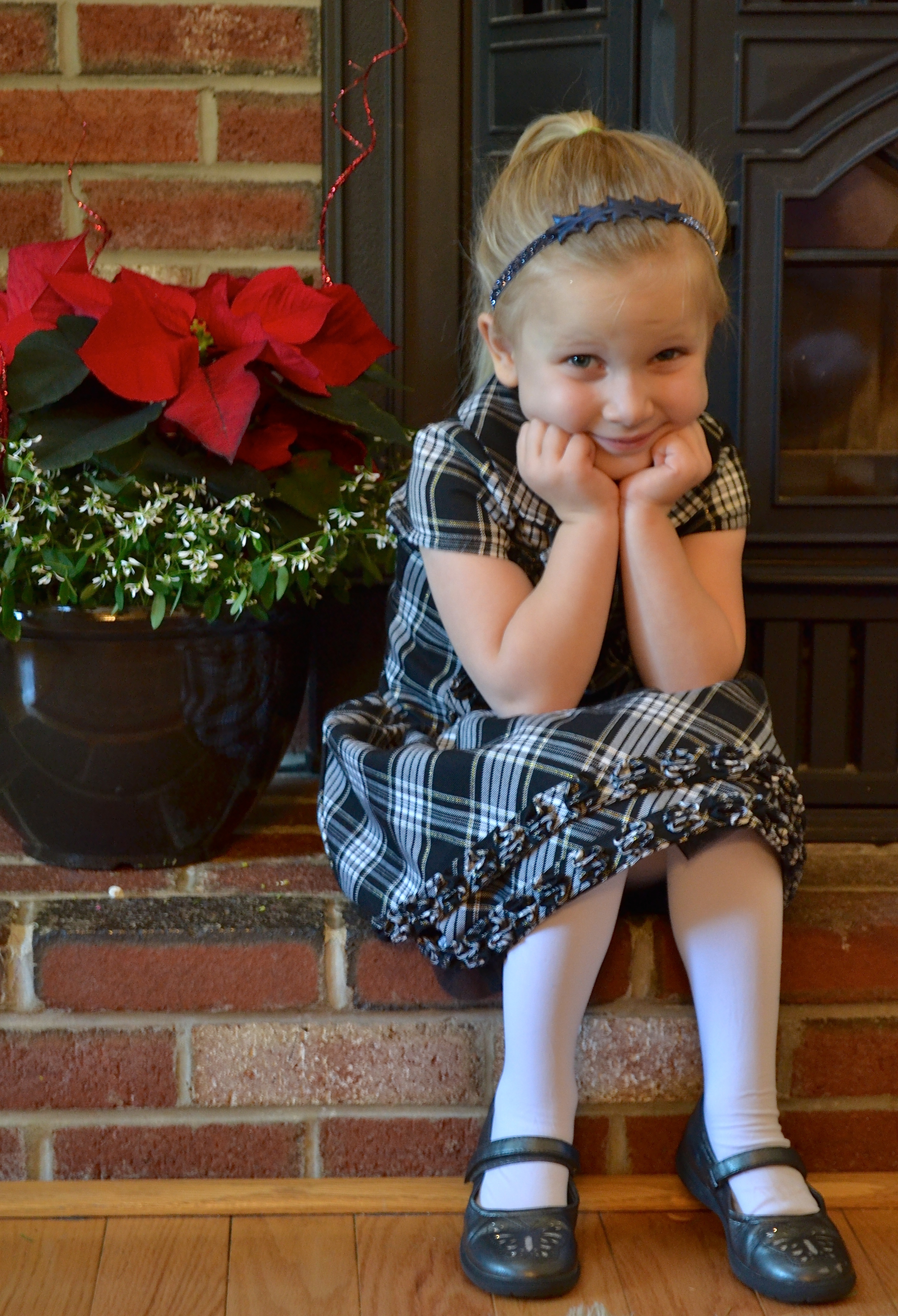 Here is darling Sarah, all dressed up in her little dress, white tights, matching shoes, and itchy hair band.