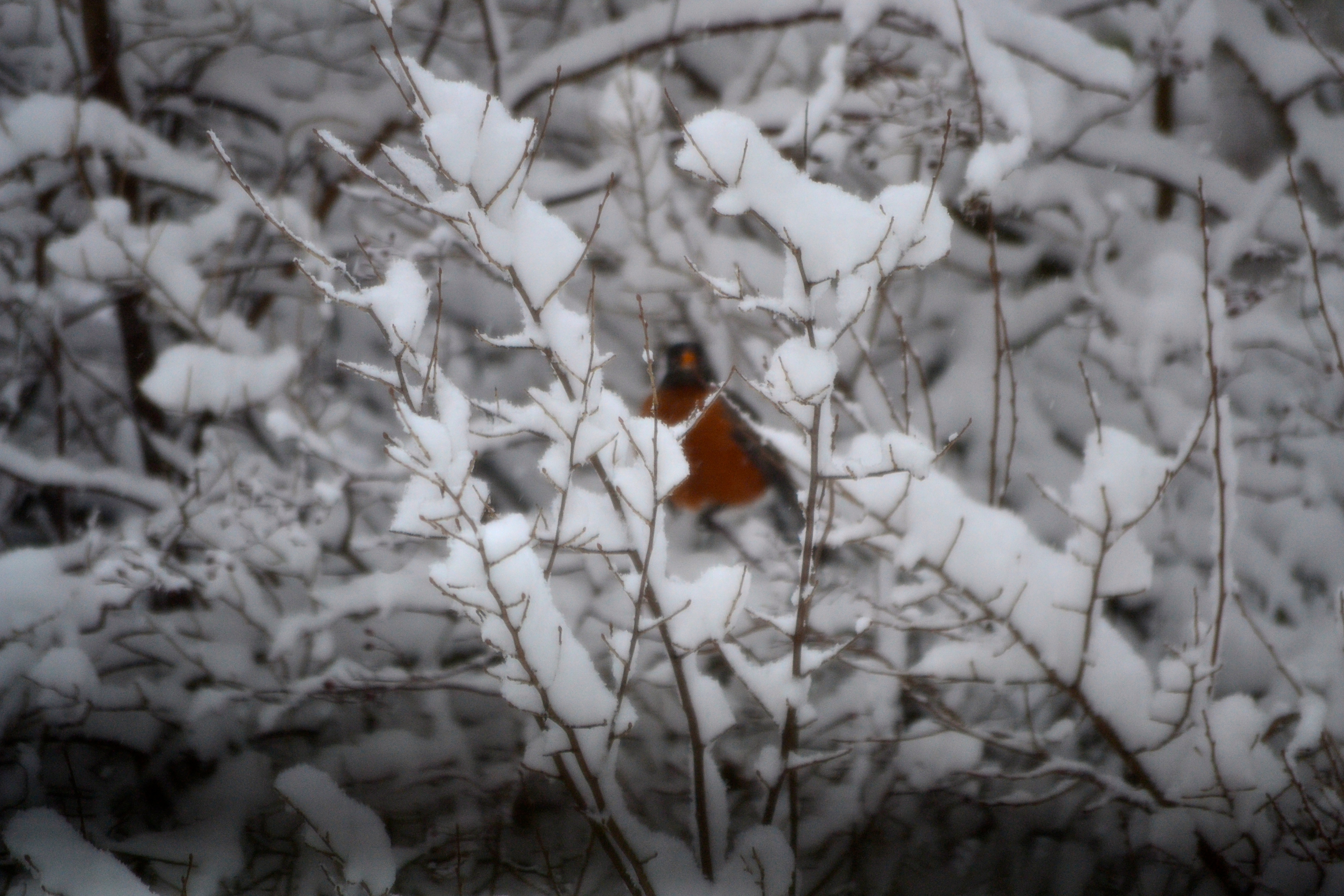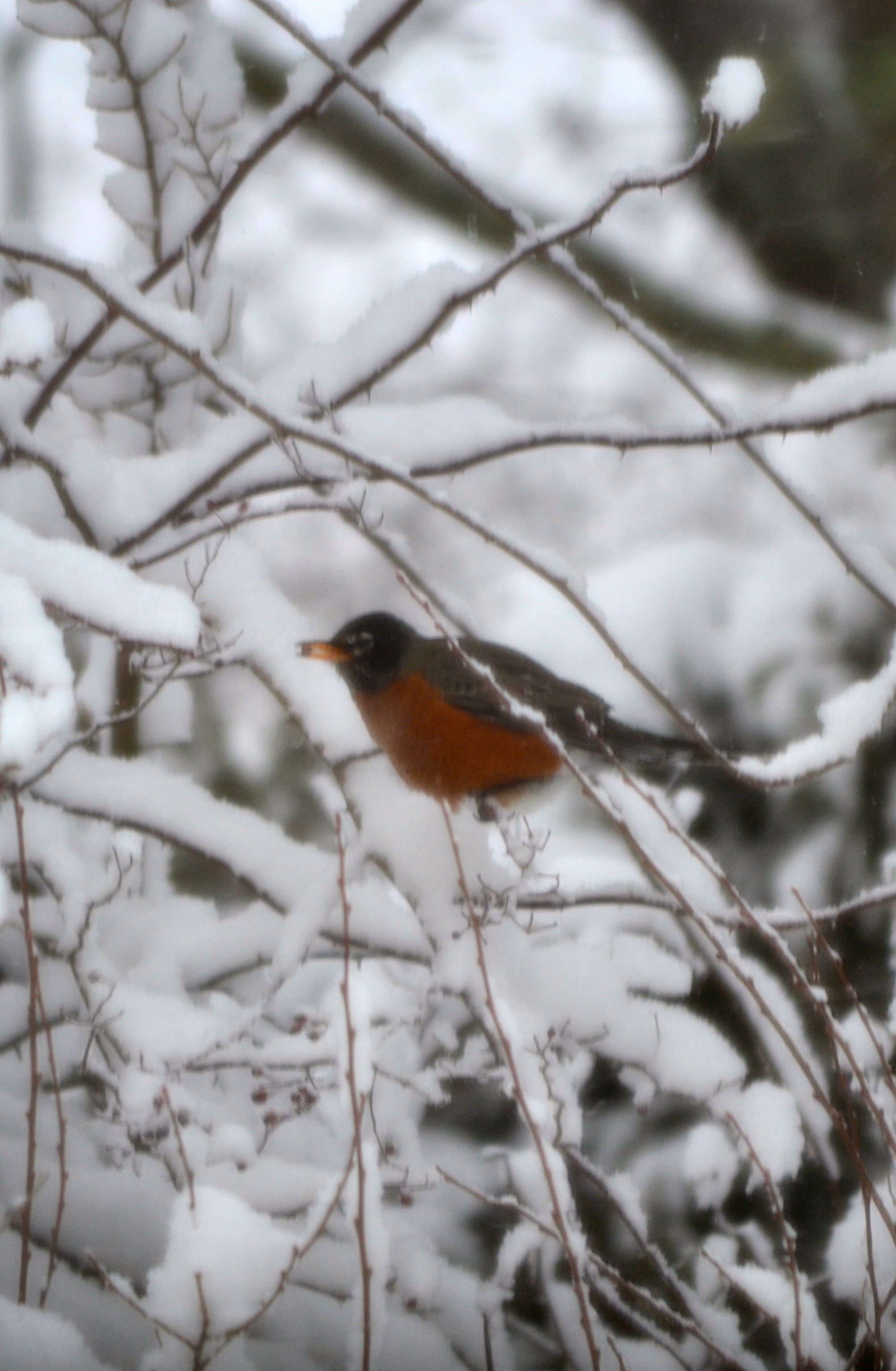 I saw a Robin fly into one of the bushes by the house and ran to get my zoom lens. The pictures are pretty terrible because I shot through glass AND screen, but it was a lovely sight to see. The Robin’s feathers were fluffed and he kept trying to perch on various thin branches, losing his balance, which caused his wings to fly out in order to steady himself. The Robin reached for berries as I wondered if he was getting enough to eat. He seemed to sense my question and turned around to show me under his tail feathers (see above, last picture). “I have enough to eat but my behind is caked with snow.” After the initial shock of seeing a bird butt, I sent through the air my silent sympathies and best wishes.