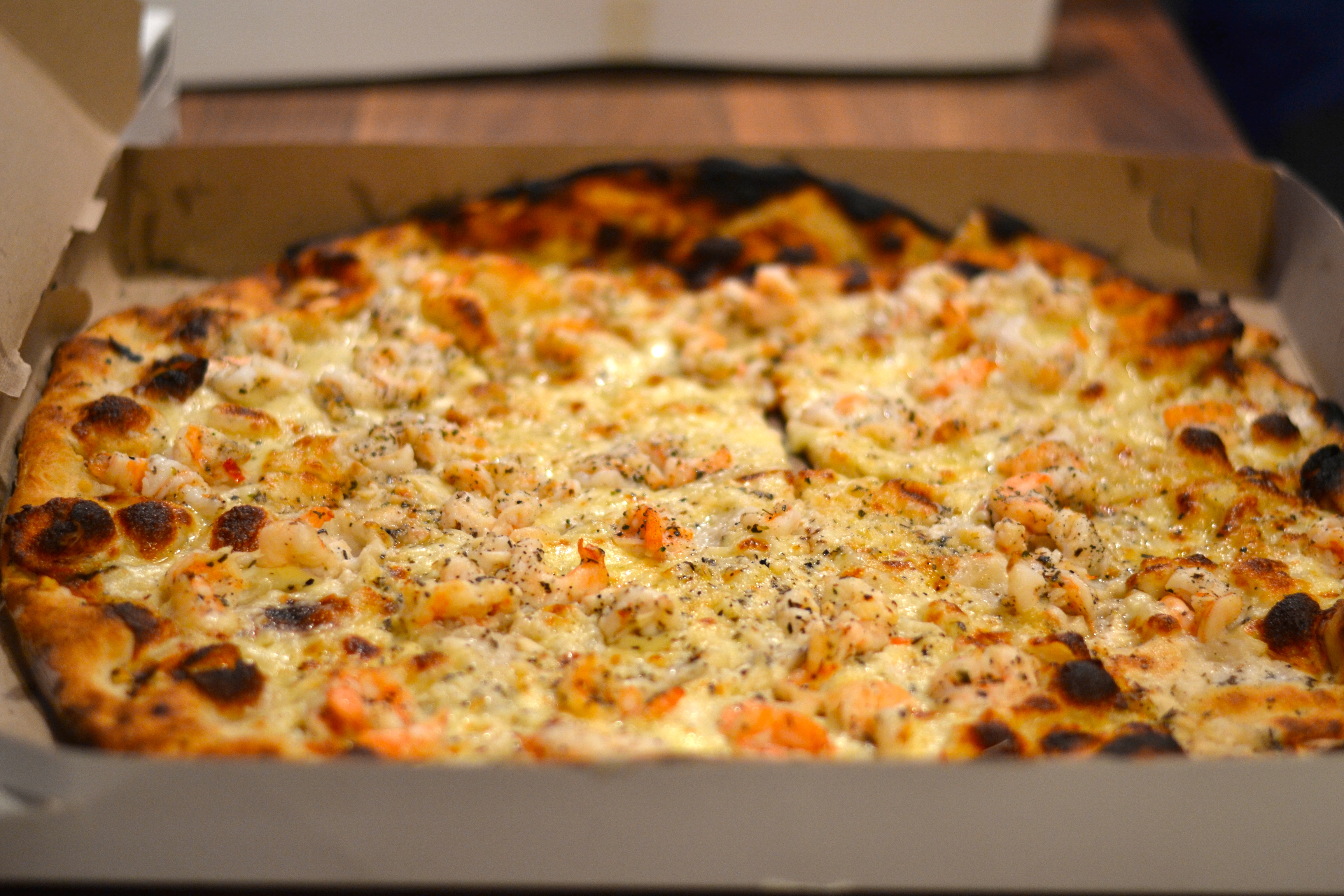 He loves the clam pizza but their supplier is having bad luck, so we ate shrimp instead. With lots and lots of garlic yumminess. There was a meat pizza for the others. As I gaze at the photo, I am tempted to go get a cold leftover piece from the fridge.