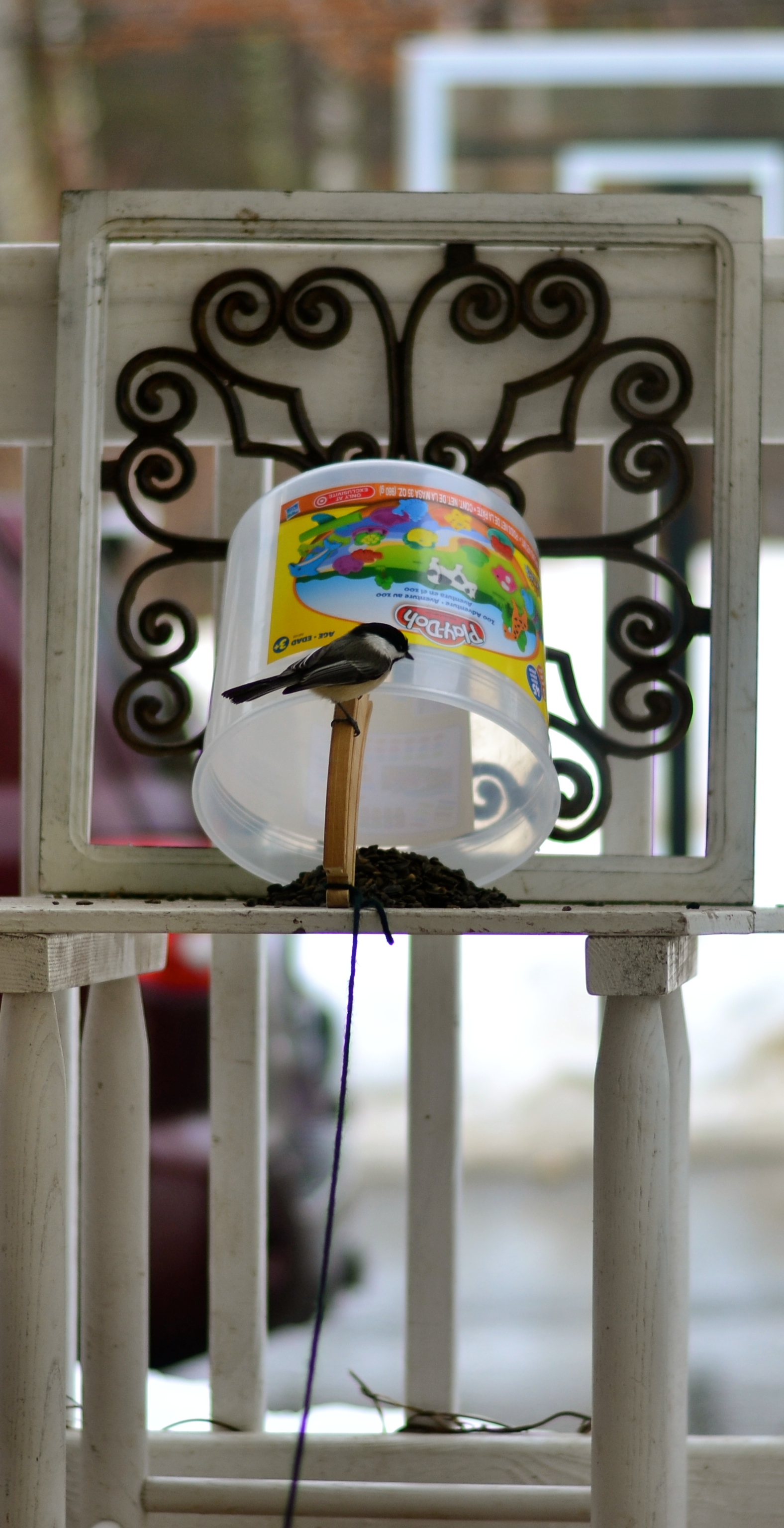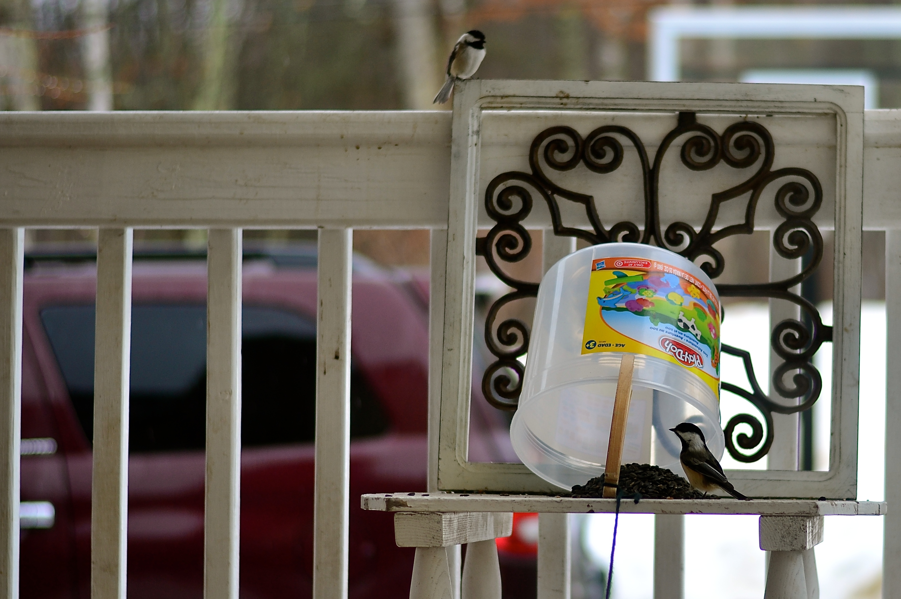 He had to get up to brush the seeds completely UNDER the bucket because they were choosing seeds that were in safer locations……”Now they’re dedicated to go all the way under there.”