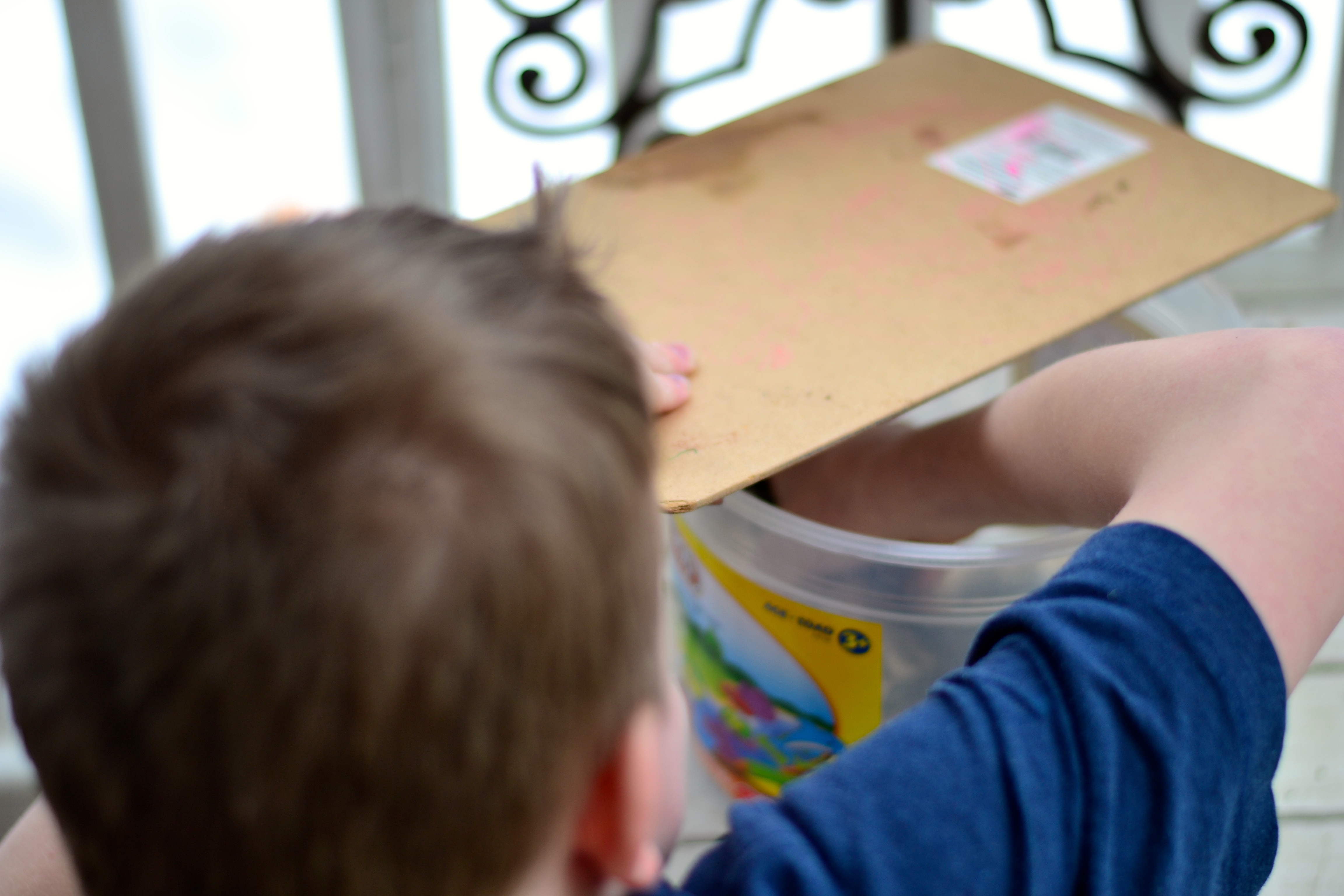 He took a clipboard (you could also use cardboard or whatever) to put on top of the bucket. He wasn’t planning on holding it but I encouraged him. He was shaking a little as he tried to gently catch it in his hand.