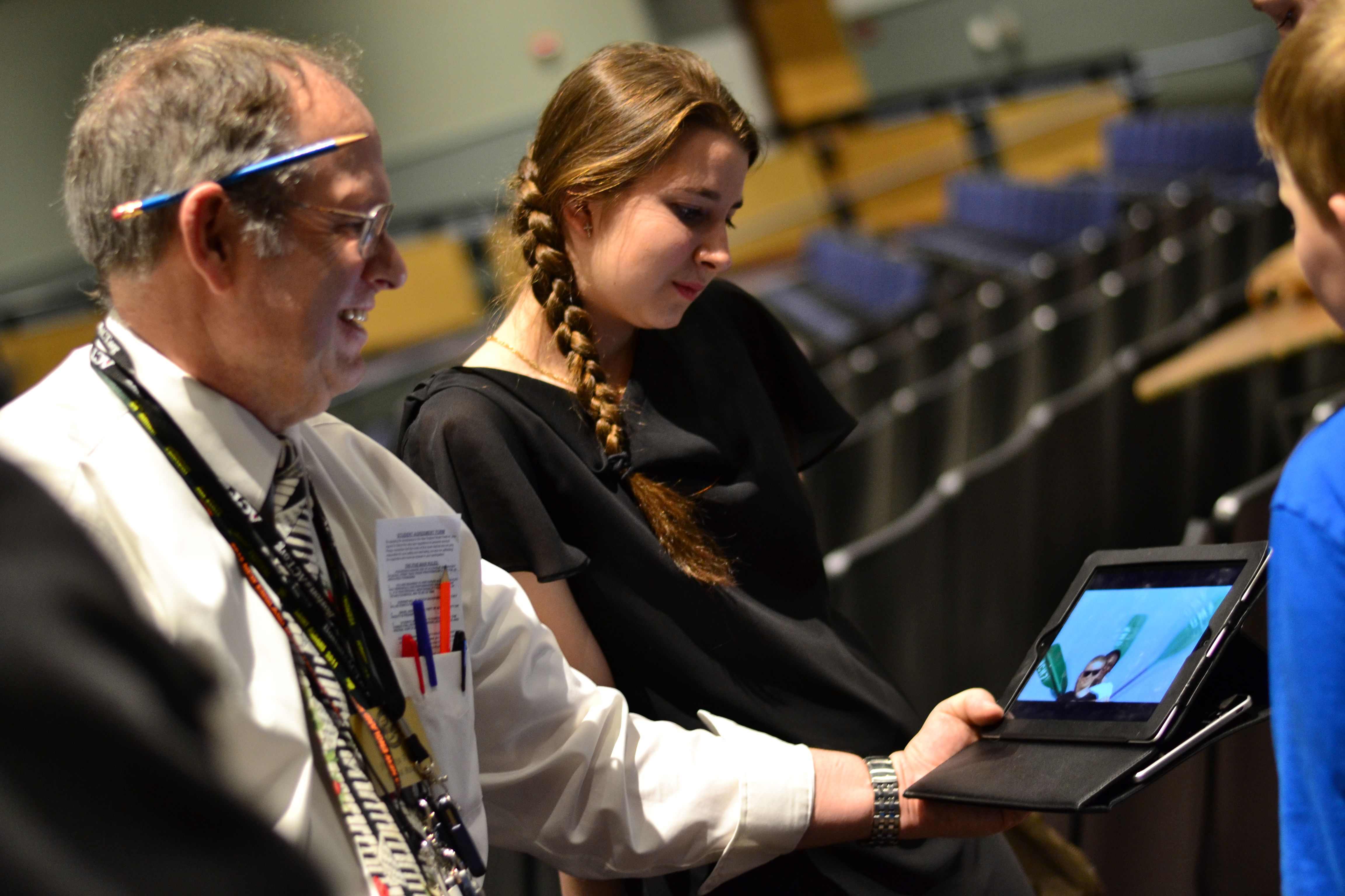 All too soon the concert was over and so we filed out of the room to wait in the hall with about a thousand other people.  Finally I saw Grace heading toward us and the first thing she wanted me to do was take her picture with a set of twin boys.  The boys were singers who were homeschooled and Grace loved them (in a friendly sort of way).  Then she bid me to follow her back into the auditorium so I could meet the manager of the entire festival, who has a deaf daughter.  Grace wants to be a deaf interpreter so she immediately began a friendship with this man and they signed to each other.  He wanted to show her a video that his daughter’s deaf camp put together of the song, “Happy”.  We all stood around and watched it on his iPad and then it was time to say good bye.  He said he would be looking for her next year.