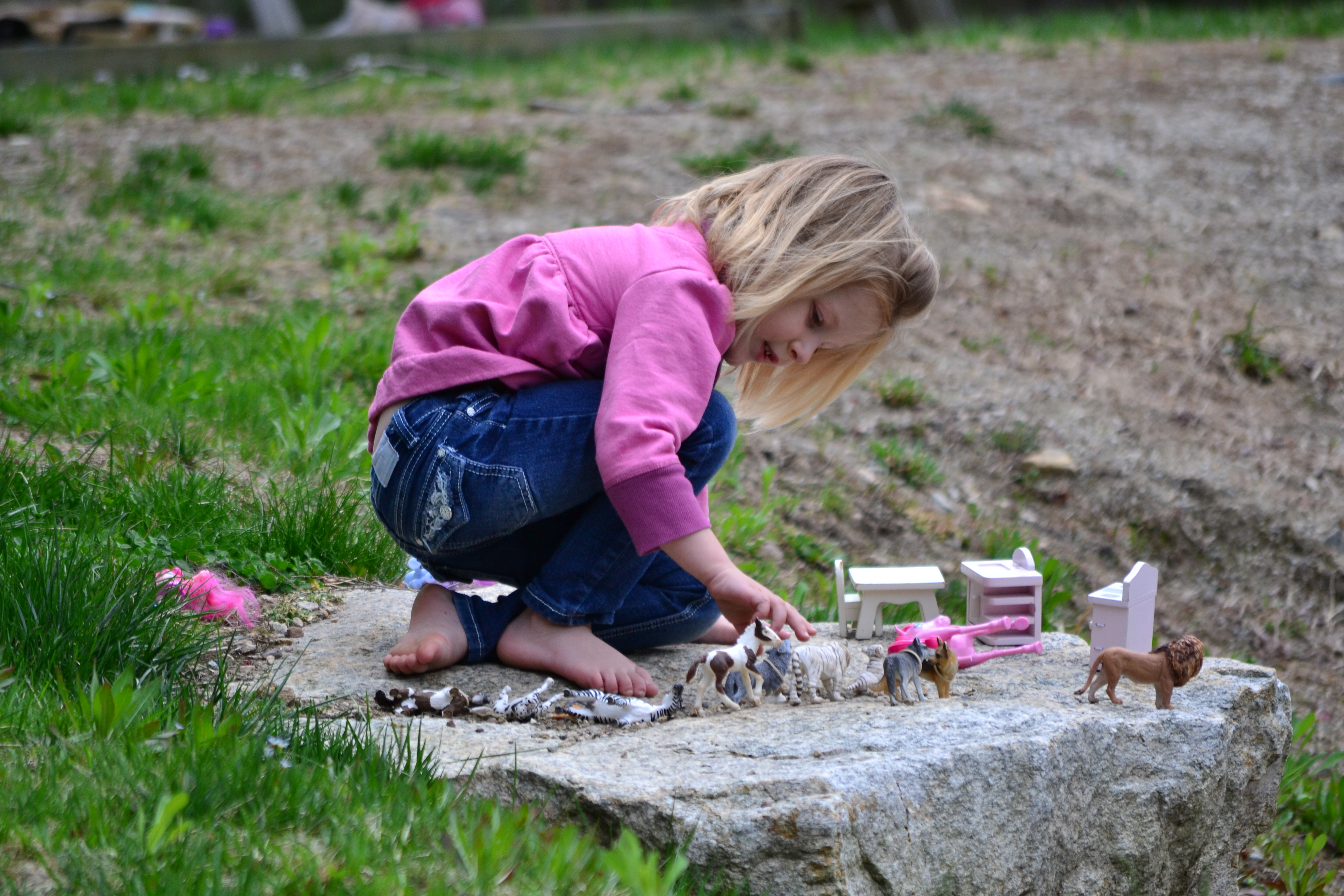 One day Sarah played on a rock while I read a book.  She loves making up little games and stories with her plastic animals.