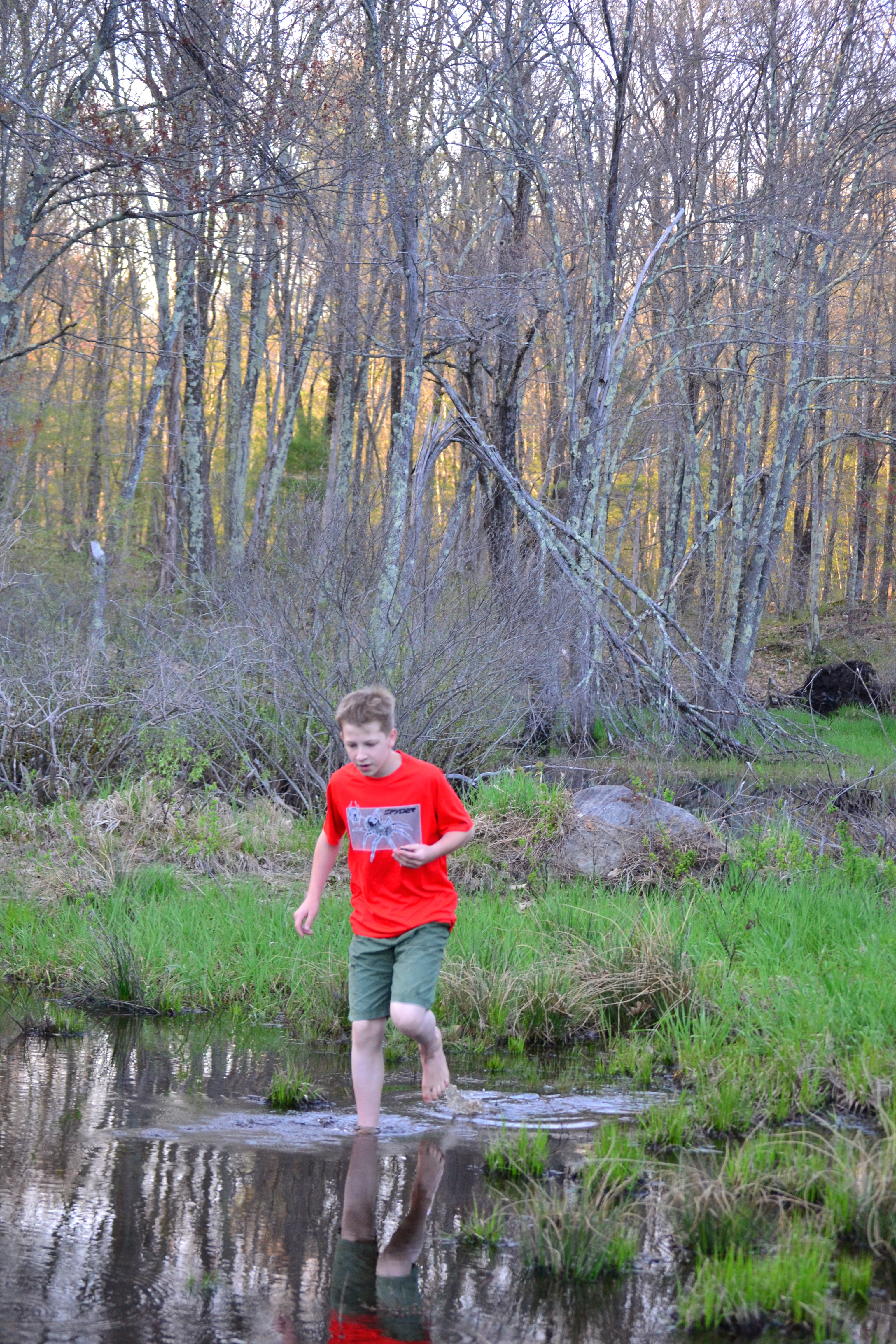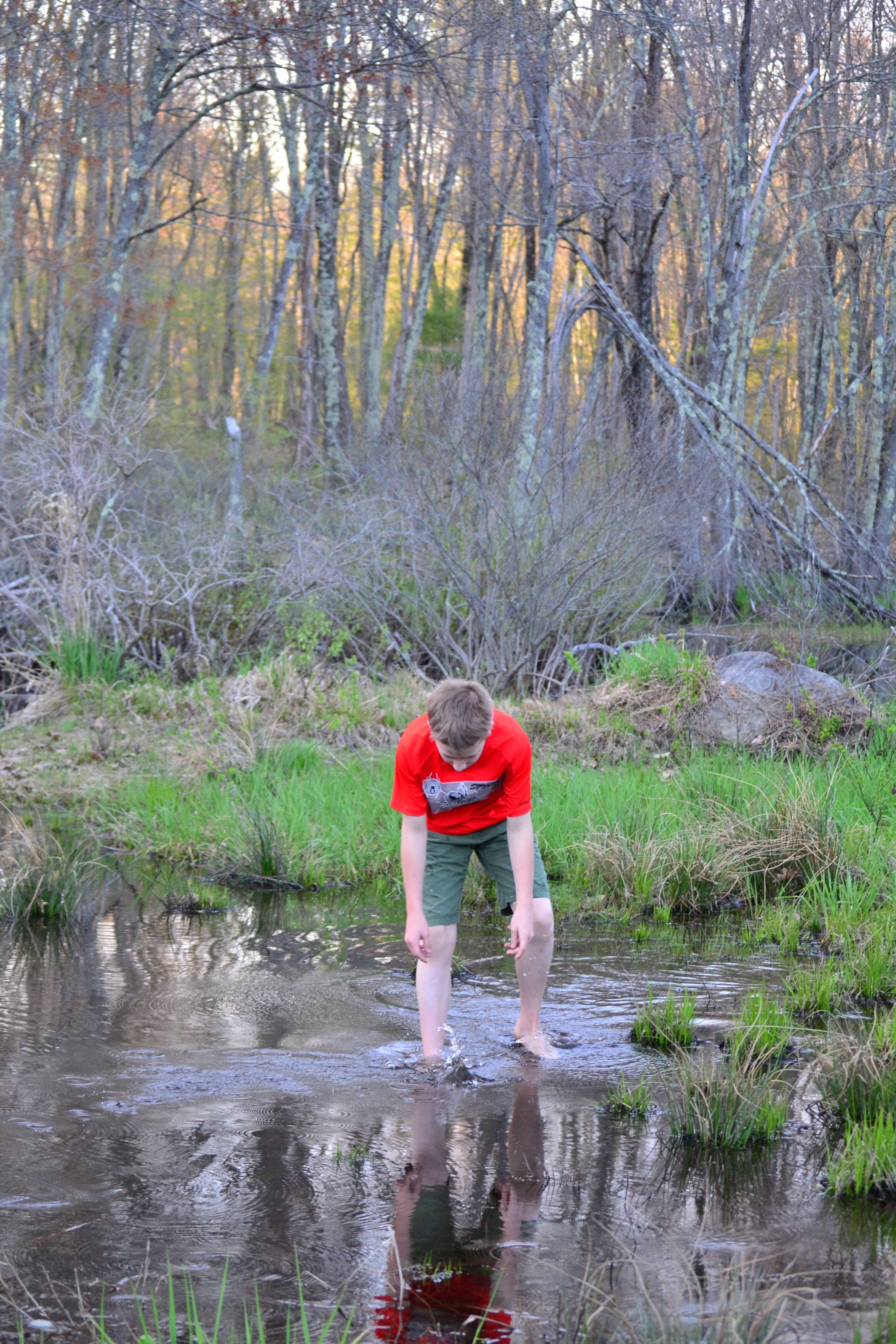 One evening last week, I went for a walk with Grace, Dave, and Seth.  We went to a part of the stream that spreads out more like a very small shallow pond.  David had fun walking around in the water catching toads.
