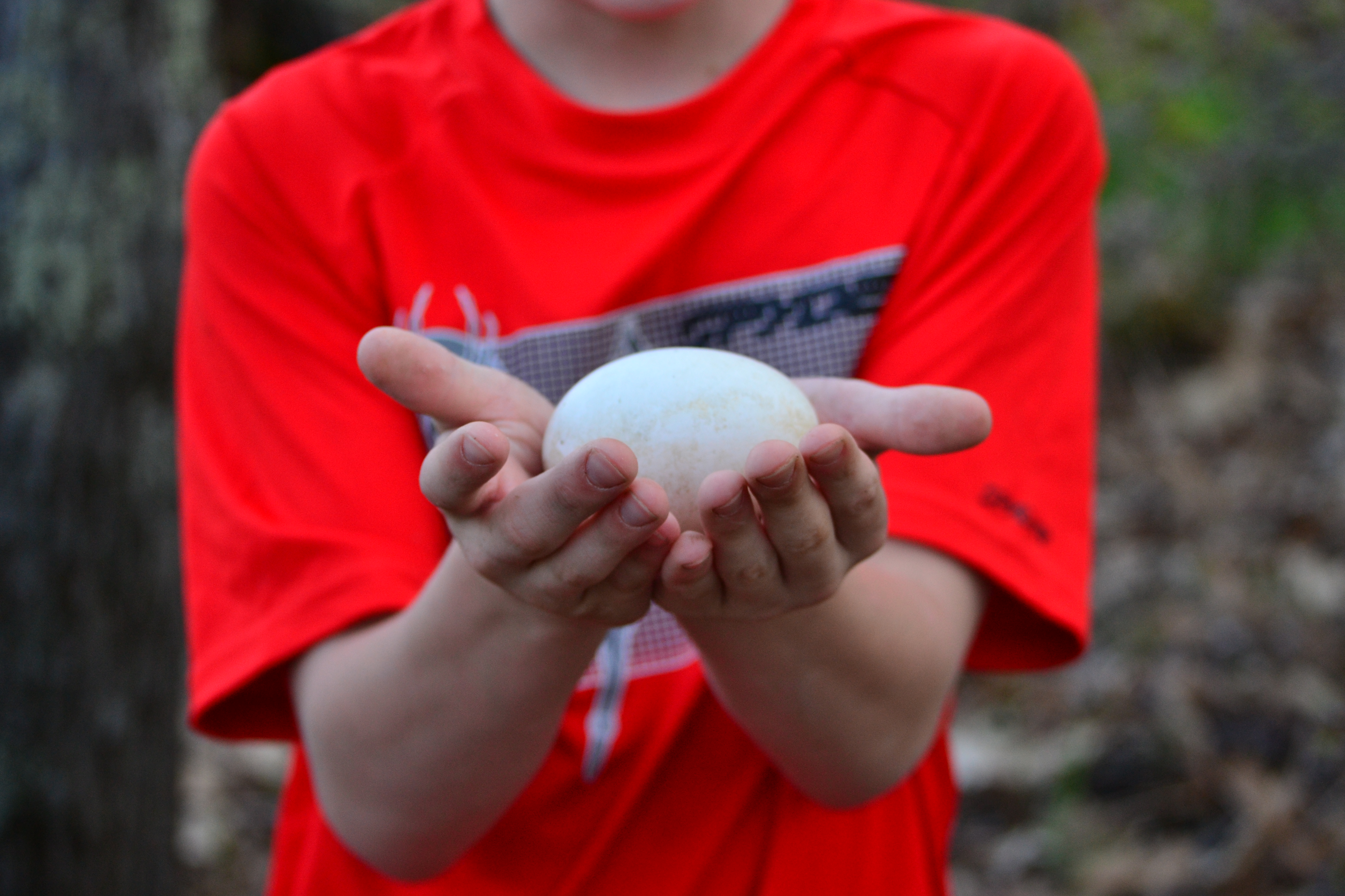 There is an old beaver lodge there and we noticed that it was covered with downy feathers.  I wondered if something had caught a bird and ate it.  But then, we saw that there was an egg about 8 feet away, along with the remains of two other eggs, just the shells cleaned completely out.  Perhaps licked?