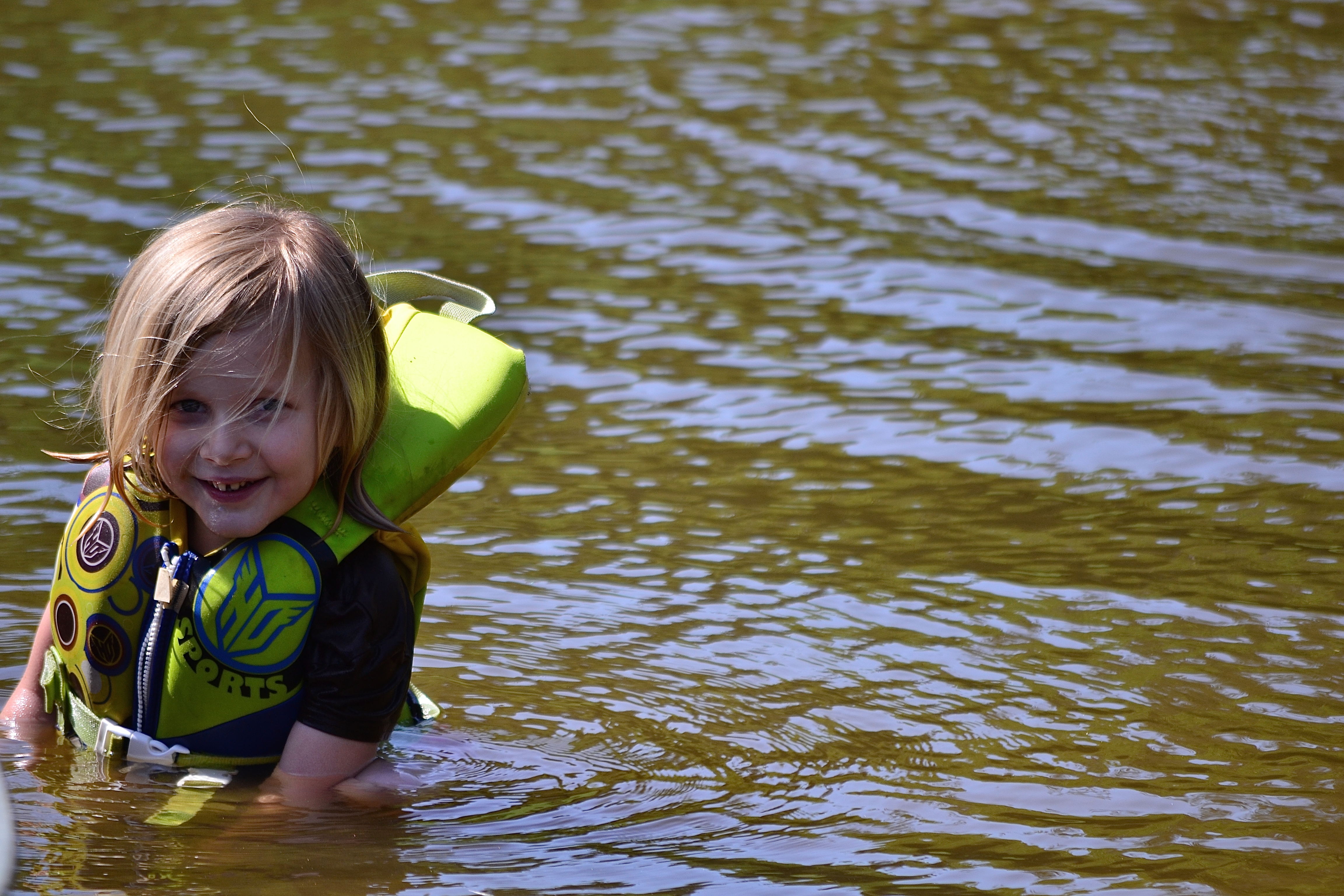 Oh Sarah.  She’s just thrilled to “take a bath” in the pond, which is what she calls “swimming”.  She’s a little more brave this year and will walk out to her waist in water.  She is still bragging that she knows how to float (with a life jacket, mind you).