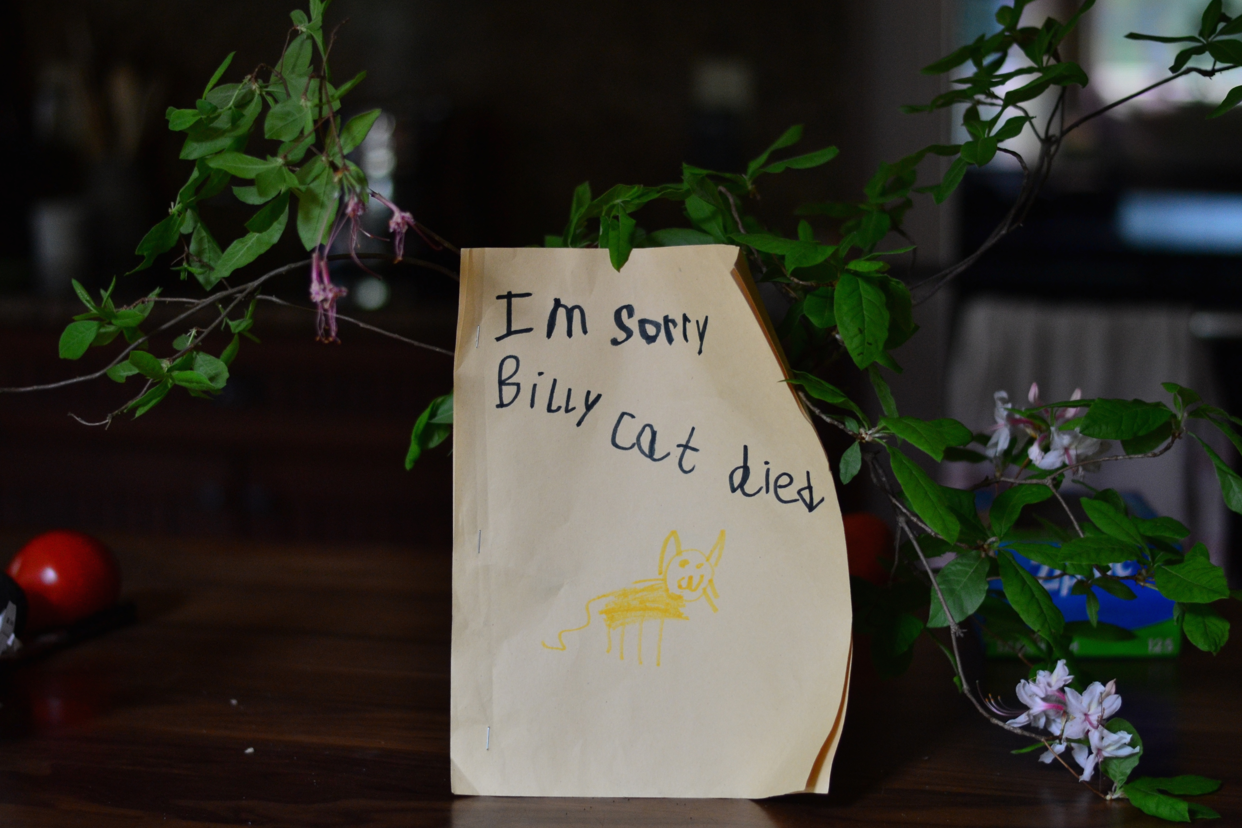 There is a homemade card on the counter that Seth brought home, which is propped up against a vase of flowers.  In Kindergarten handwriting are the words, “I’m sorry Billy Cat died.”  It’s bothering all of us that it is there.