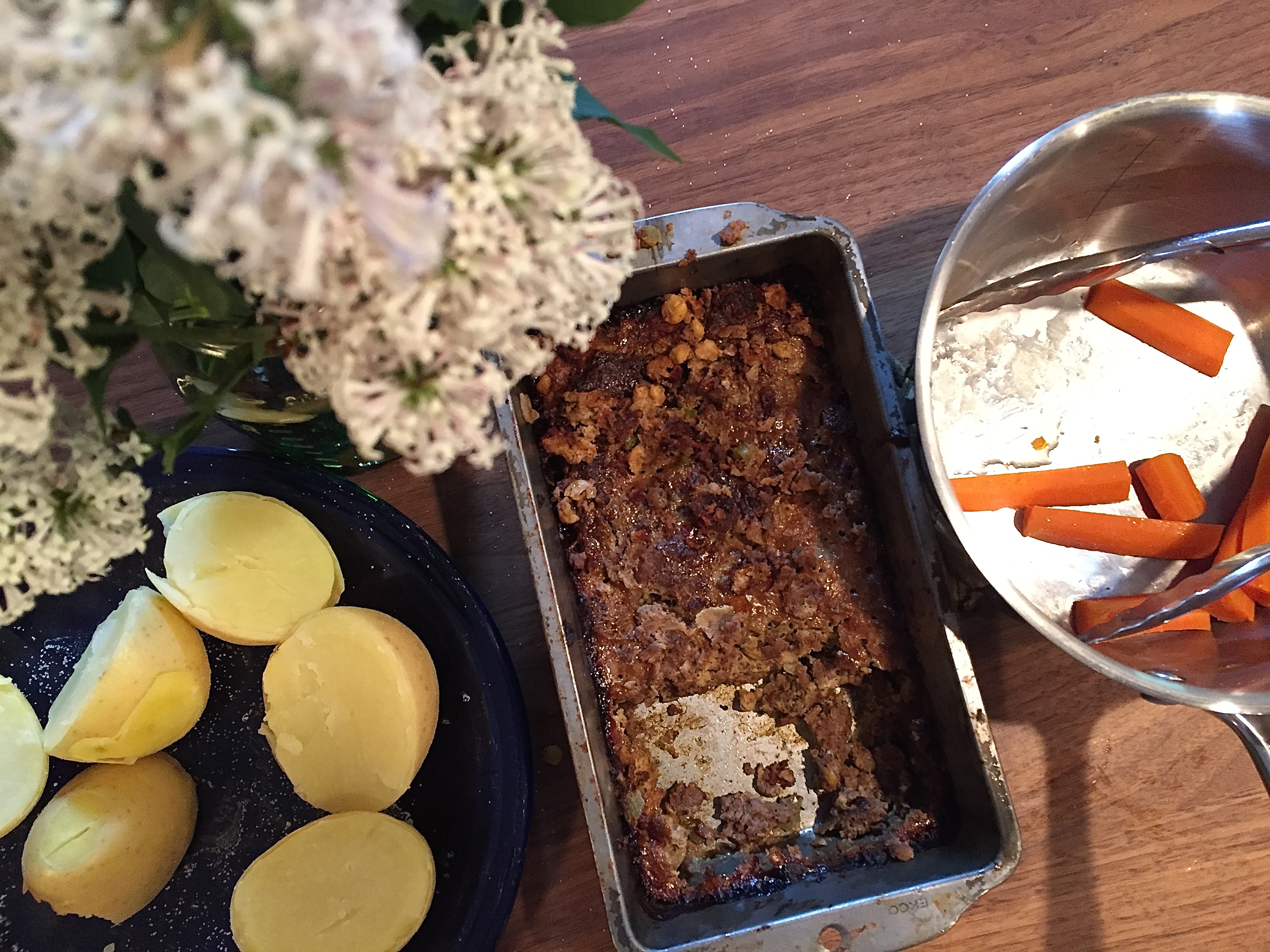 I doubled the recipe and we ate one whole meatloaf, plus a quarter of the 2nd.  The boiled potatoes weren’t a big hit but I will be making a small batch of Aunt Colleen’s fabulous potato salad with the leftovers.  I peeled and sliced dark orange organic carrots for a side dish, too.