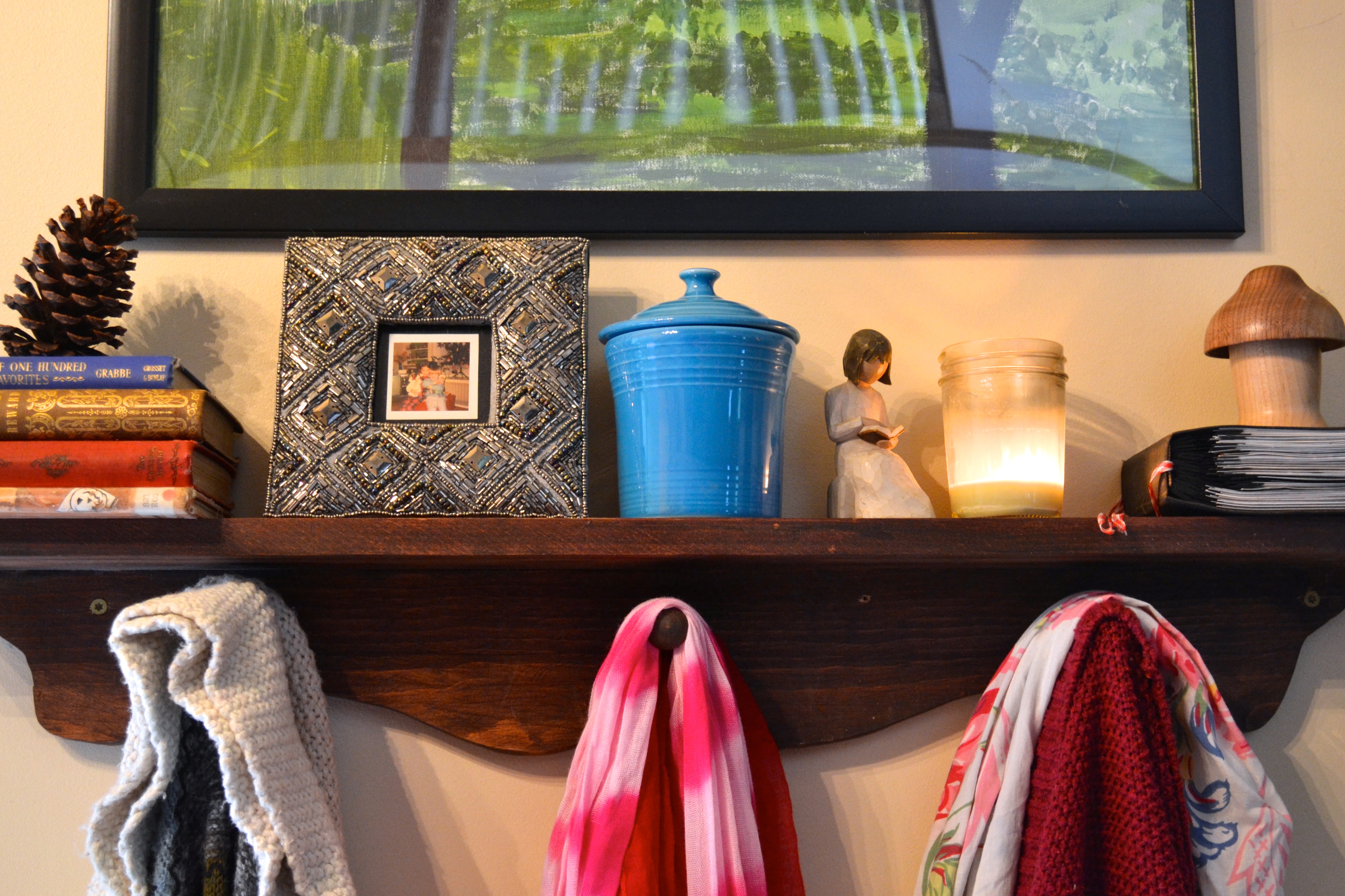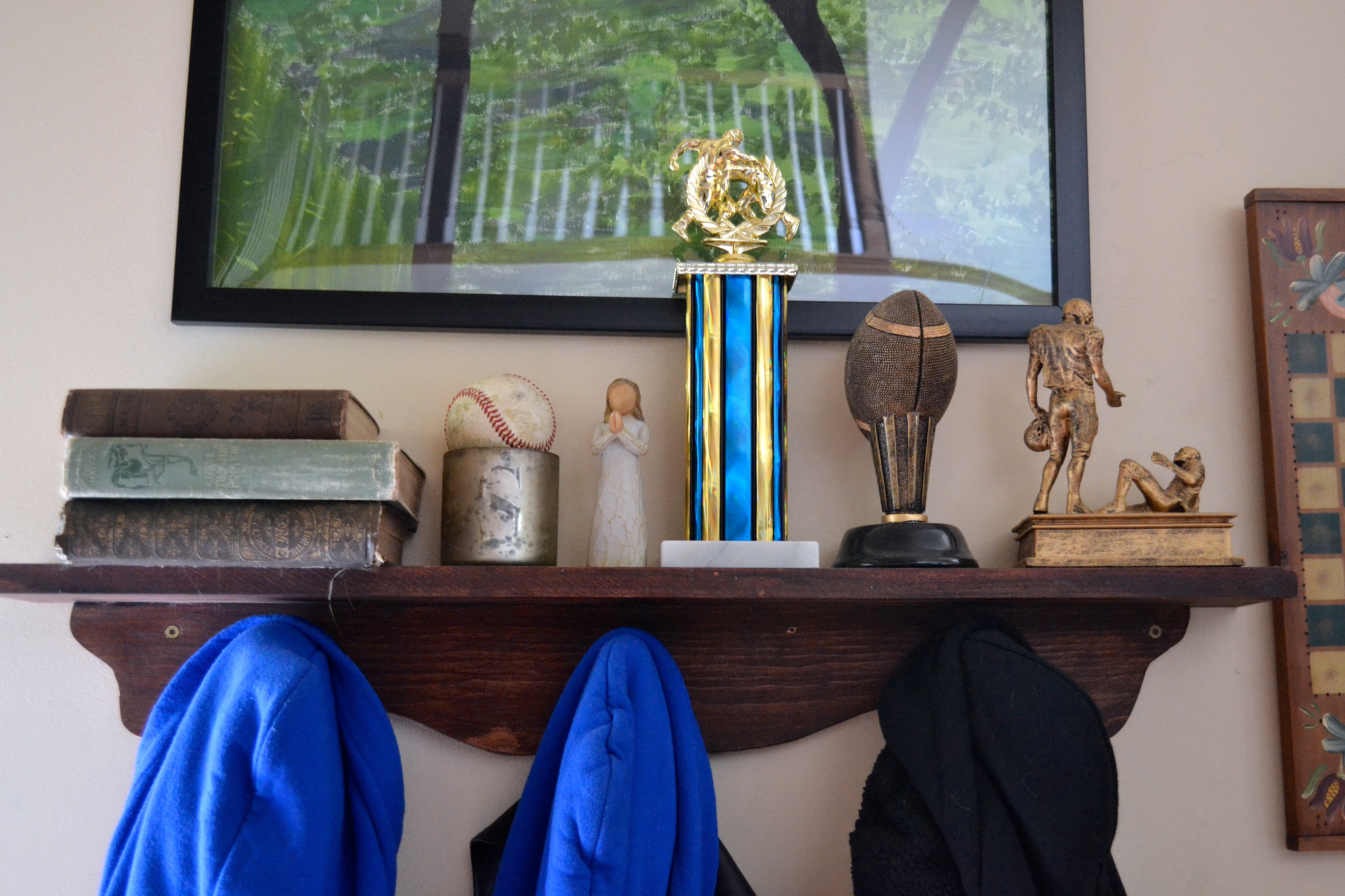 Ethan made the decorative shelf in 8th grade. I put the things on top of it and they’ve been there for a very long time. Because no one and I mean no one even thinks about redecorating a shelf when they’re super busy.