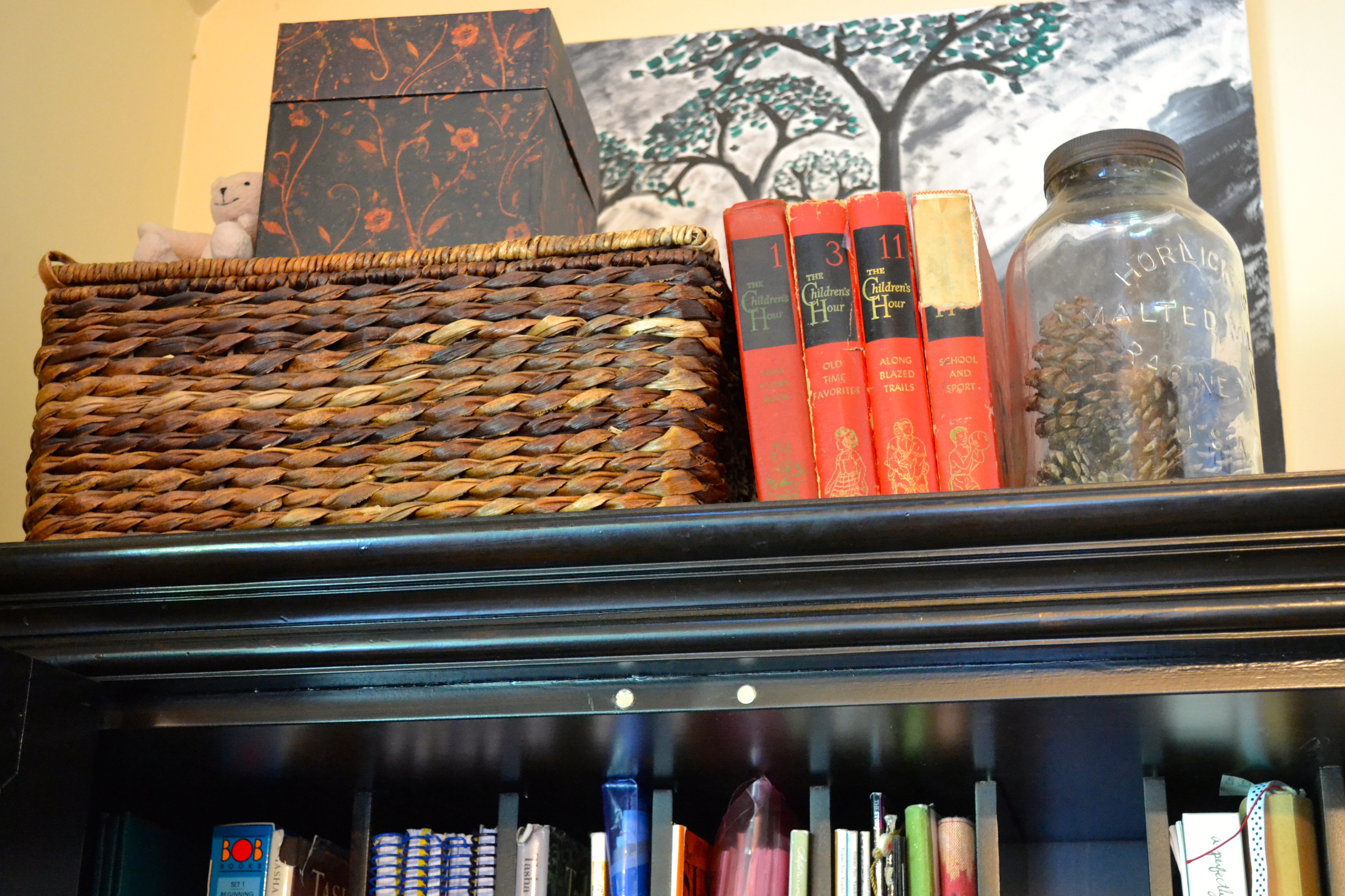 1. a large basket full of photo albums 2. a tiny bear (whimsy) 3. a box full of extra pens and pencils 4. These red books are special to me. My Grandmother had the whole set and I loved reading them when I was a little girl. I still have one of the copies from her house. The other three I have picked up from second hand stores. The books are full of short stories and excerpted chapters of children’s books. 5. Last but not least, an old jar full of pinecones from the woods by our house.