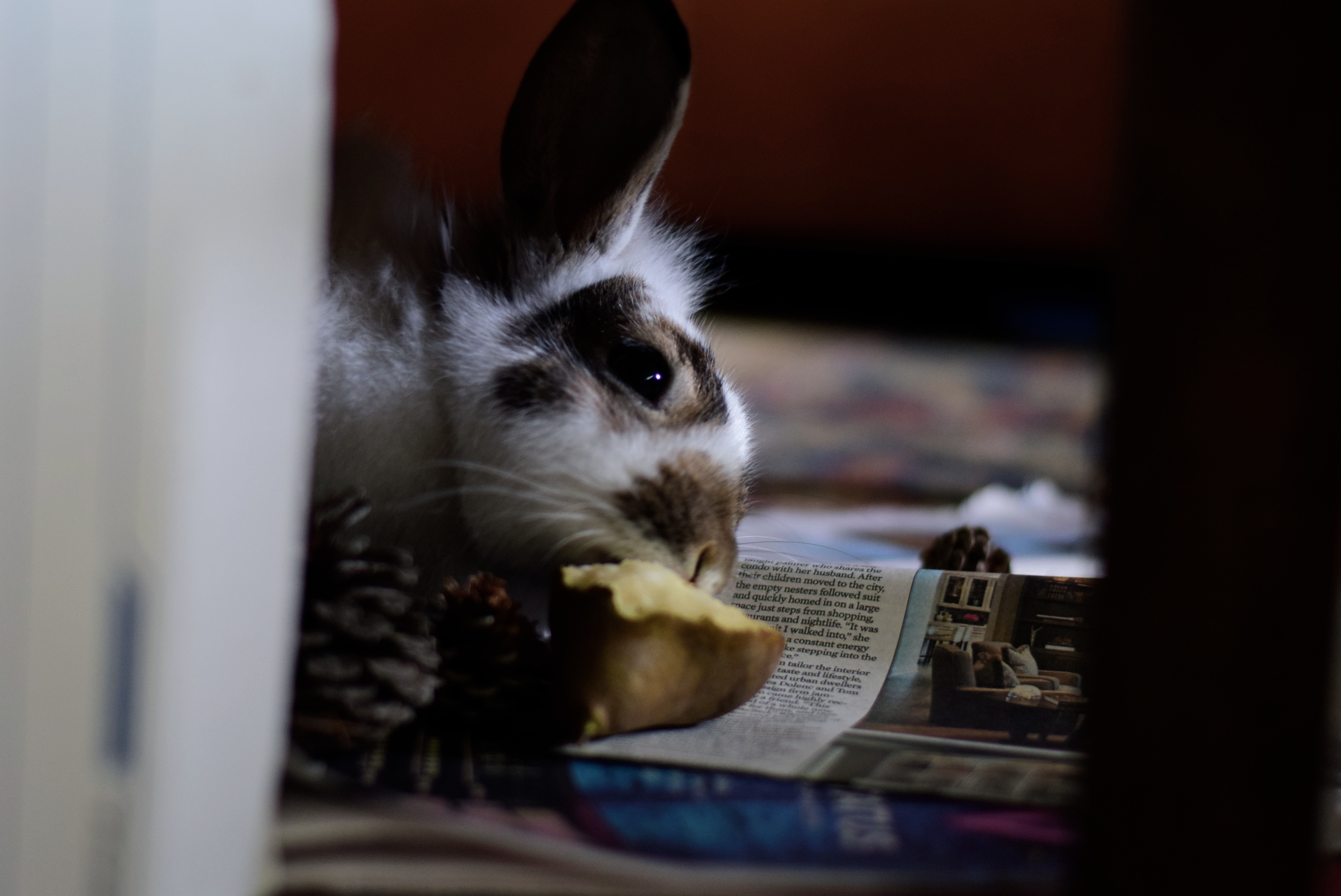 The rabbit hopped around the living room and ate a pear under the coffee table. I put down newspapers because she loves to chew and shred them.