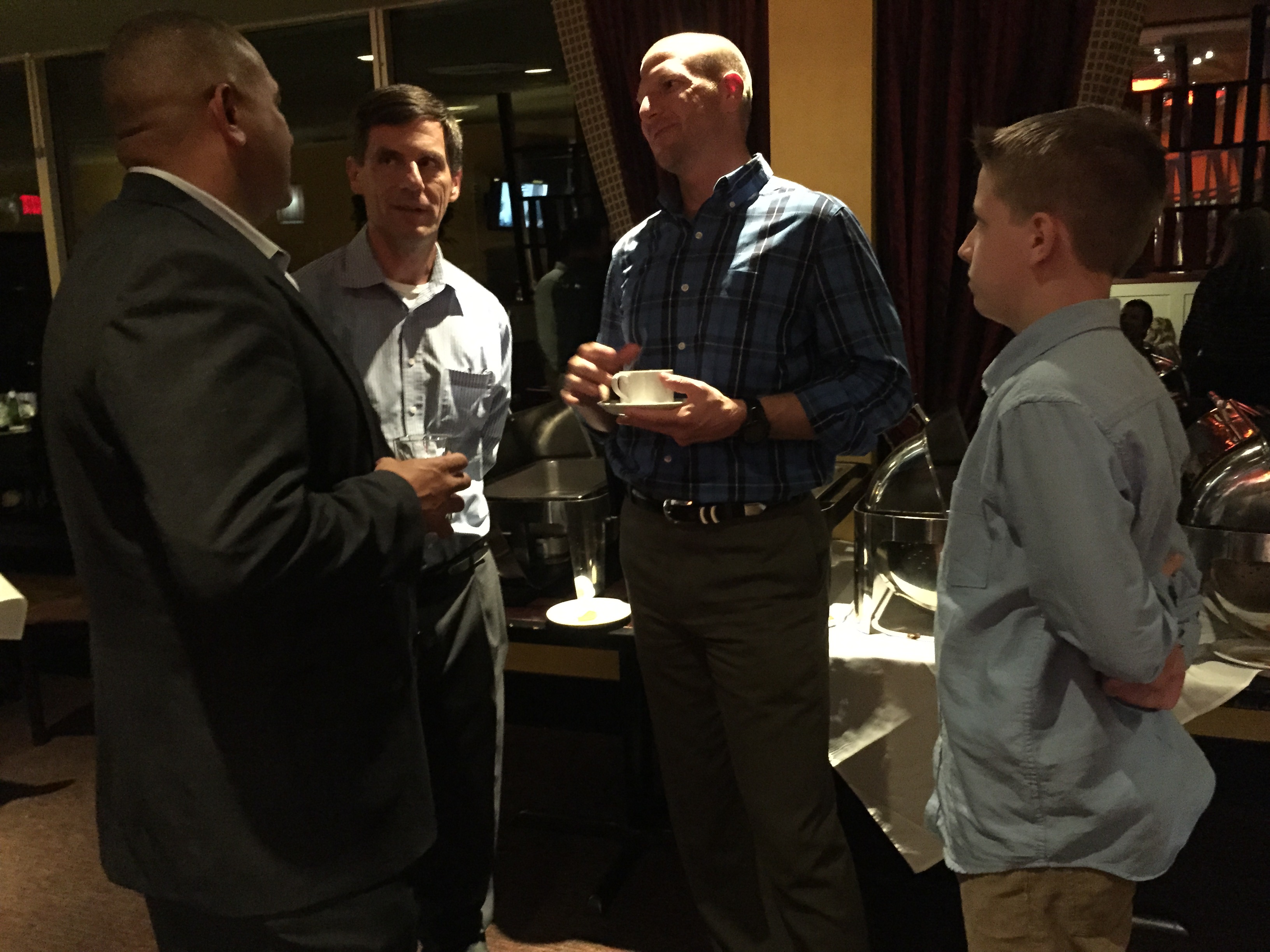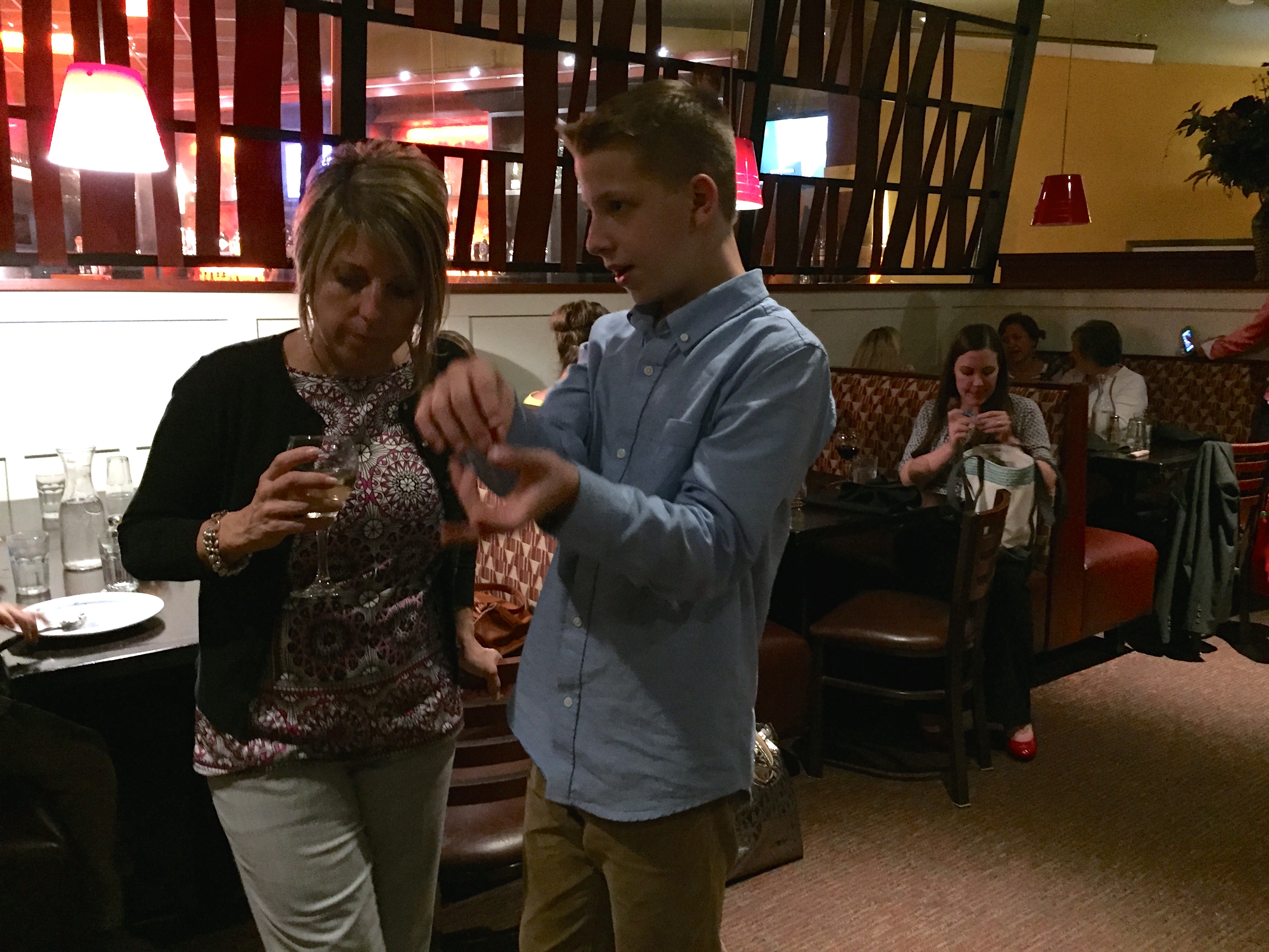 I drove the children to the restaurant and parked in an empty business lot next door so Rich wouldn’t see our car.  When Ali texted me the “all clear” we drove over, parked, and walked inside.  Ali met us at the hostess table and walked us to the room where everyone was waiting and chatting.  Rich had his back turned away from us.  Caleb reached him first, and tugged on his arm.  Rich stopped his conversation and looked down and saw his son.  It was such a special moment.  I was beaming as I watched his eyes *bug out* in shock.  He was so happy and it was such a surprise to see the two worlds he loves so much collide.