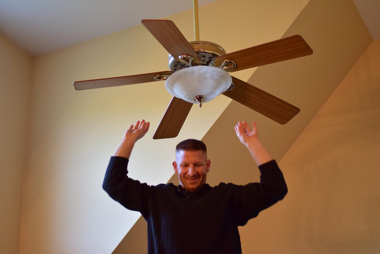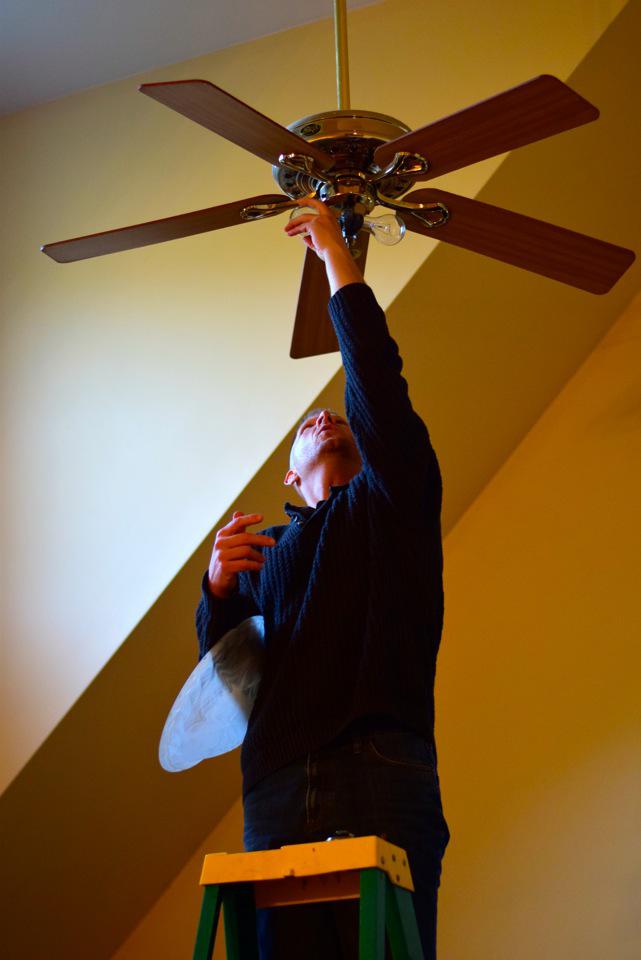 He put fresh lightbulbs in the ceiling fan on our cathedral ceiling.
