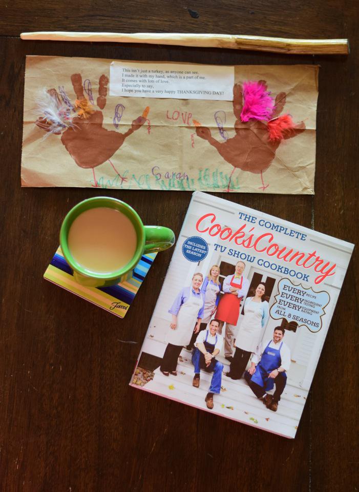 David made a Harry Potter wand all by himself out of a small tree he cut down in the woods. Then he carved it up and shellacked it. Sarah made turkeys out of her handprints. The Cook’s County cookbook is the one I got the jello cake from. Today I’m making a raspberry chiffon pie!