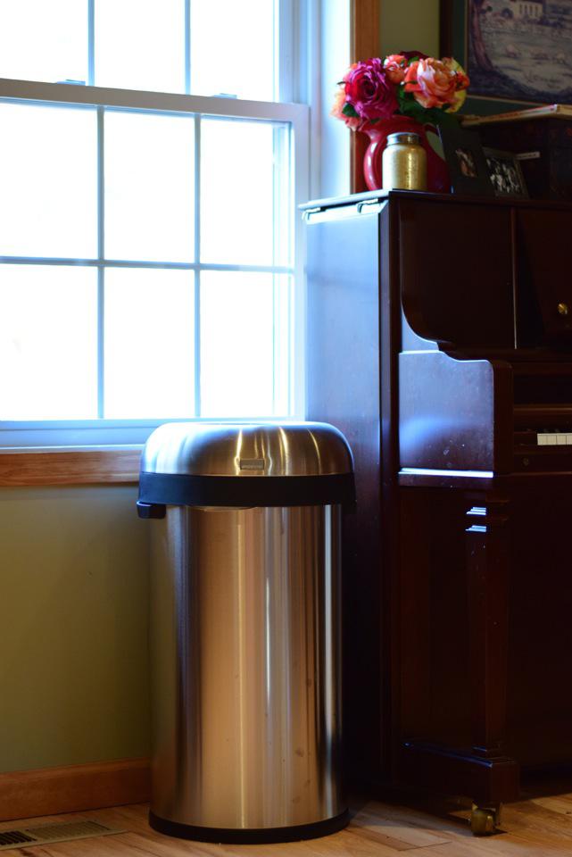 I love my new garbage can. We needed one for our dining room and this one is beautiful. It also has an open top (flip lids are an extra step) to “make baskets” into. Sarah can look right inside the top and see her papers from school that I throw away. Then she can get them right back out again.