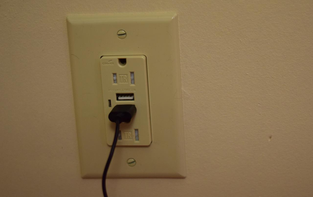 He changed out this outlet. It used to be a plain old outlet but it was loose in the wall and nothing would stay plugged into it, the cords would just fall out. It’s an important outlet because it’s on the wall at the end of the couch and we like to plug in the electric blanket and phones there. Consequently, while he was at it, he bought an outlet that has two slots for phone chargers, too. Very convenient. It’s amazing how such a small change can lift one’s spirits.