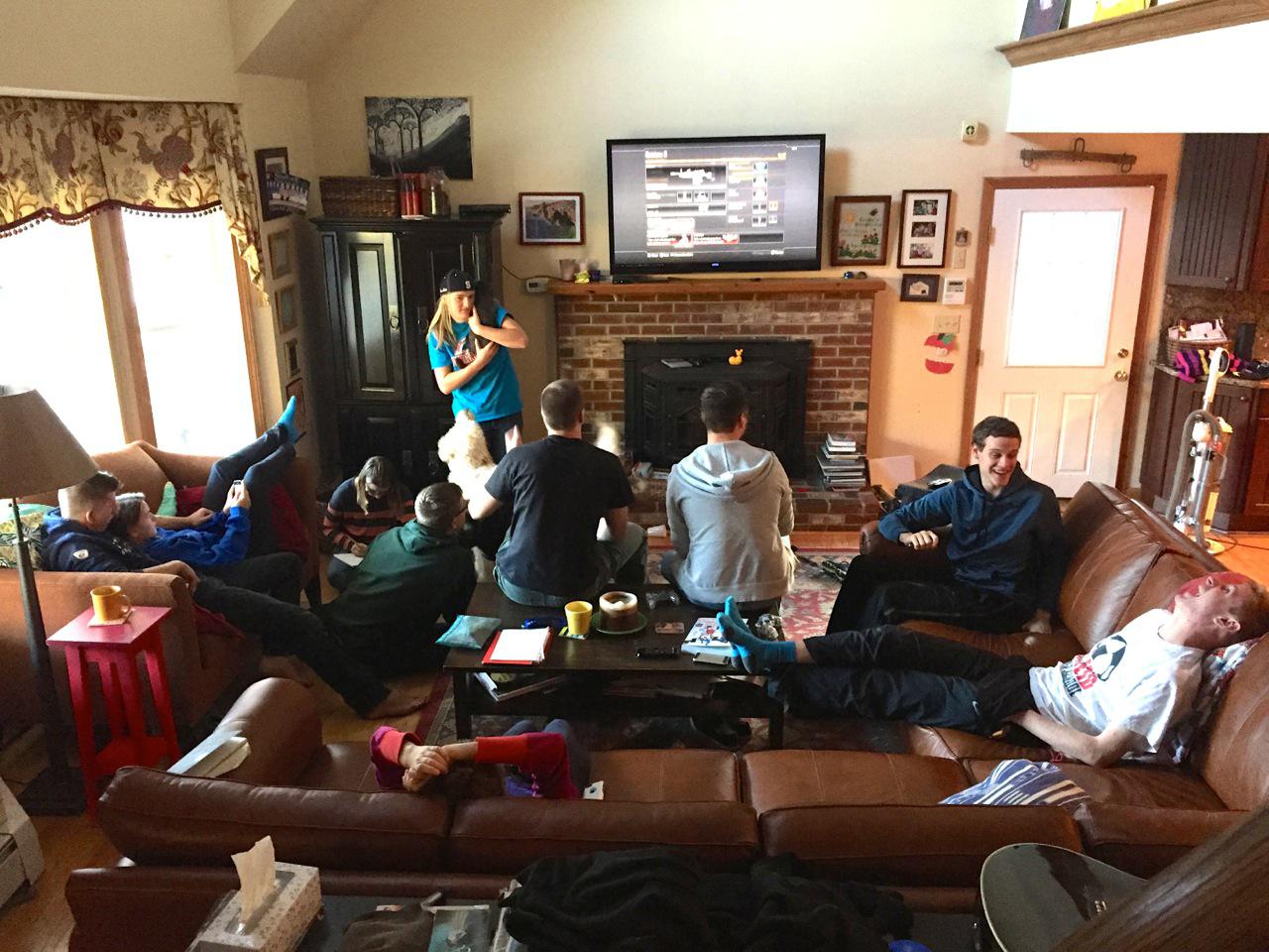 It wasn’t hard to eat it all in one go because we had a house FULL. In this picture there are 10 teenagers, 2 big dogs, and a small gray cat. There are two kids not in the picture, plus Rich and I.