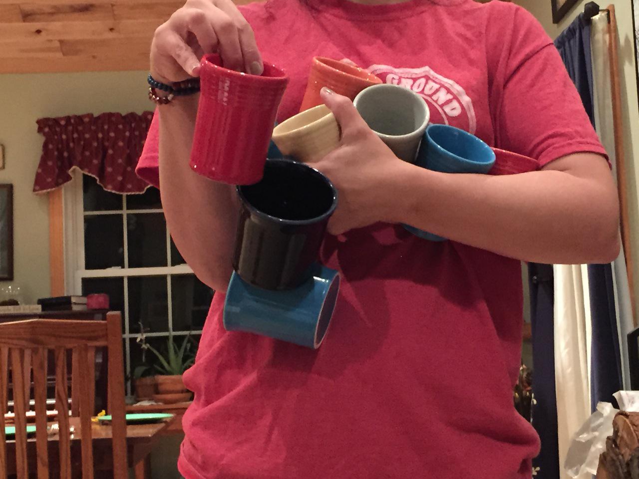 Ethan’s eating off a rose plate and drinking ice water from an ivory tumbler.