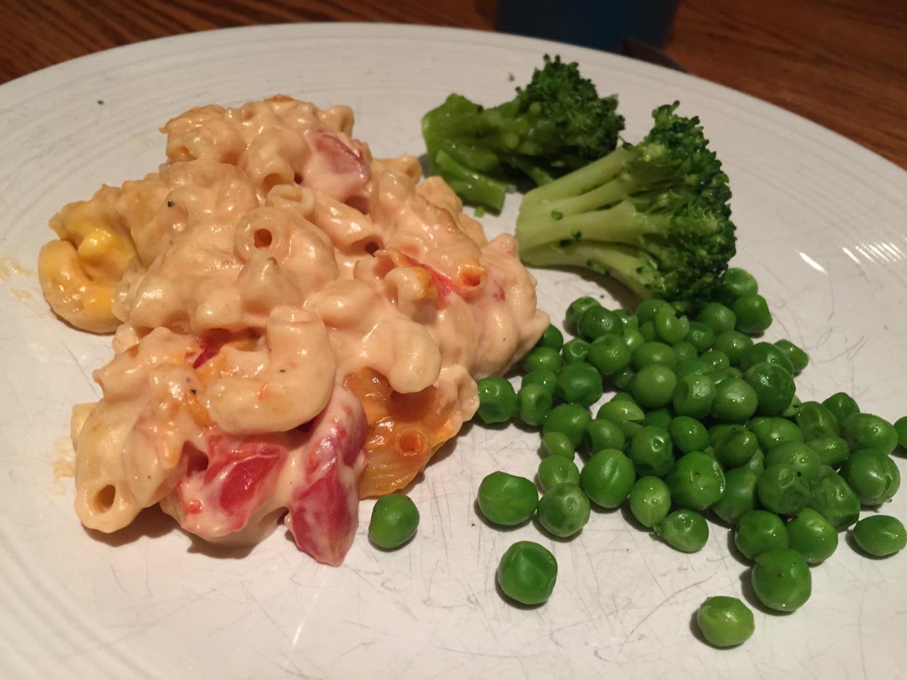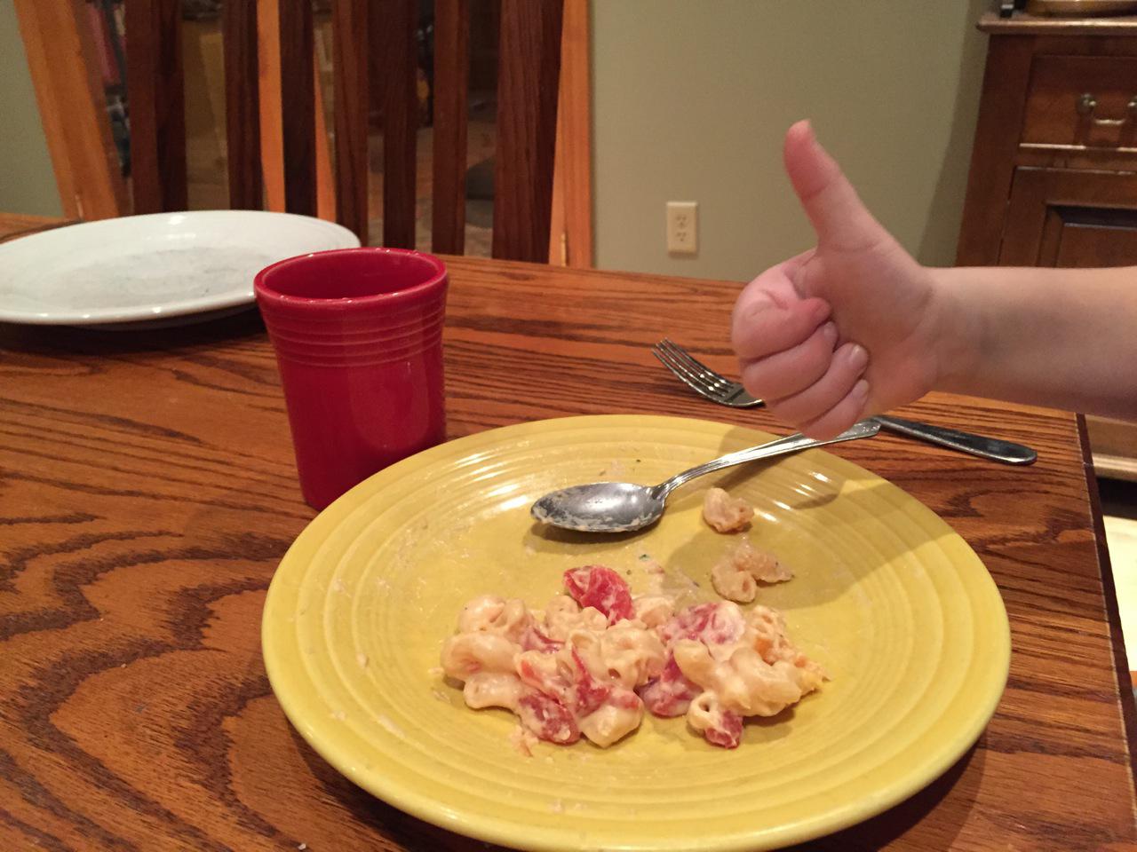 Sarah ate like a horsey, with multiple servings of macaroni and cheese and her veggies.