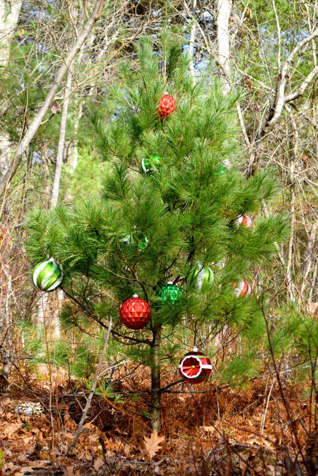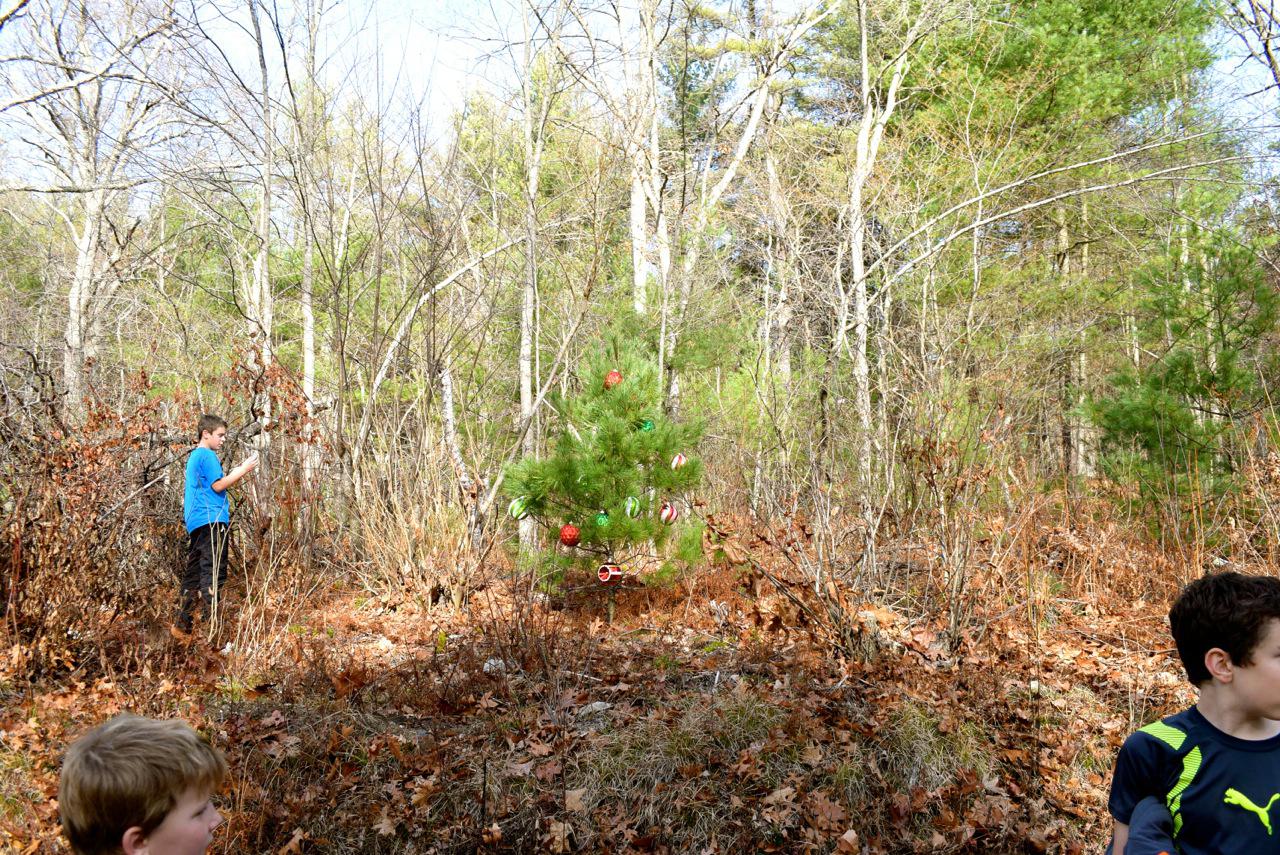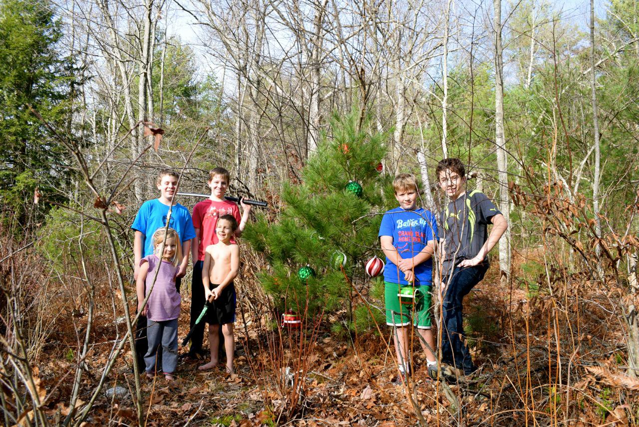 Last week I went for a walk in the sunshine and noticed a small evergreen tree growing just outside the state forest by the side of the road, not far from our house.  I envisioned it decorated for Christmas and what a fun feeling it would be to drive by and see a tree that doesn’t belong to anyone, with holiday ornaments on it.  I followed through with this vision and bought some large unbreakable ornaments today.  When I got home, I gathered up my four happy youngest children plus their two friends and off we went on a exciting short walk to The Tree.  As you can see, we had a nice warm weather day today.  Several children were barefoot and Seth was shirtless, too.