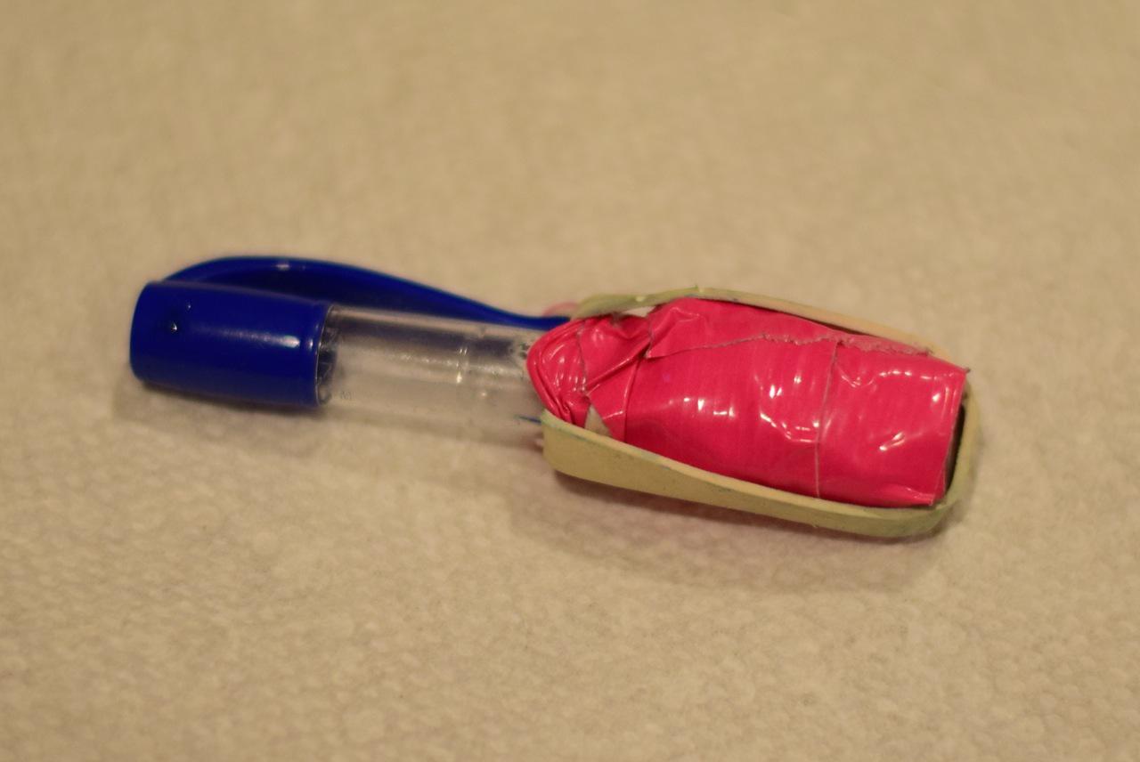 To do this, he must take a perfectly good ball point pen and take it all apart, causing it to never more be useful as a pen.  But wait!  It will soon be even BETTER than a pen!  For then, he wraps a rubber band with duck tape around the pen.  It is now a shooting device.