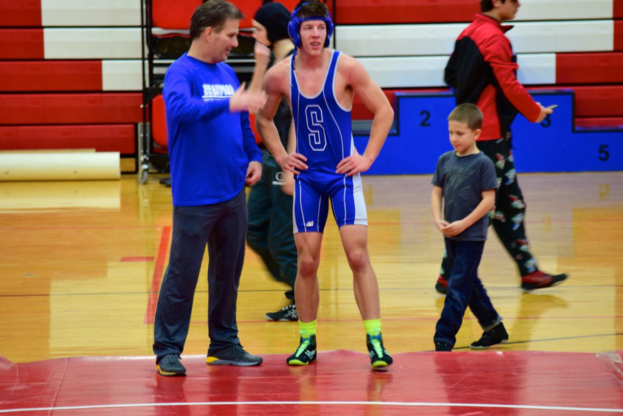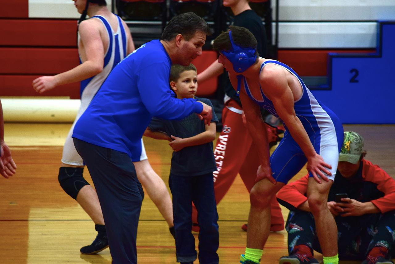 Here is a picture of Ethan after he won a match. The assistant coach is talking things over with him, his name is Jim. Little brother Seth is hanging around wanting to say “good job” to his big brother. ‘Cause that’s what you do.