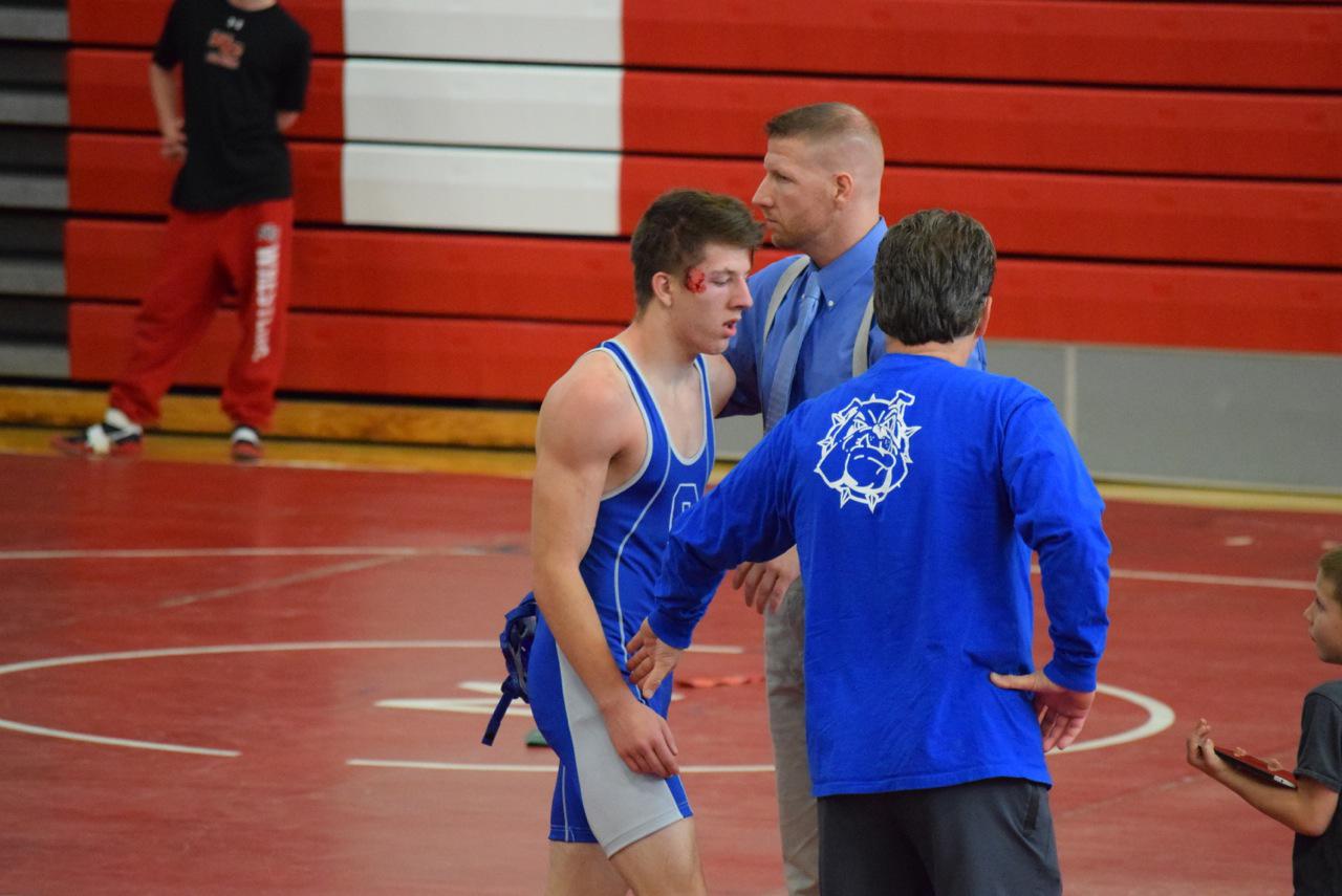 Later on, Ethan got bloody and lost a match. There’s his Dad in the background, and Coach Jim is about to take his arm and lead him to the trainer to get cleaned up. Oh and there’s Seth again.