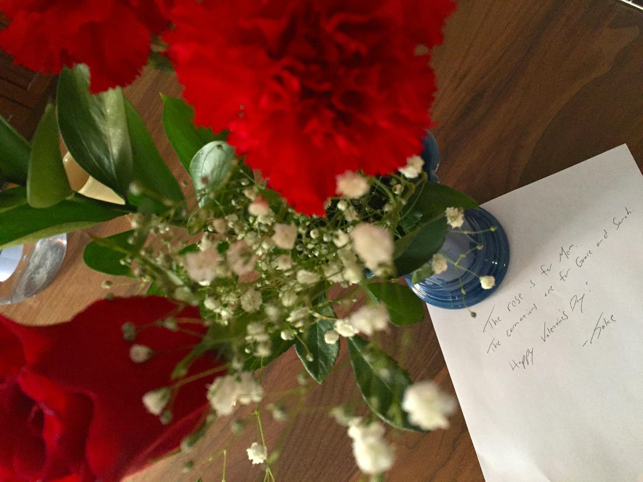 While they were away doing that, I took Ethan and Tessa to Texas Roadhouse and dropped them off. Abbie, Grace, and I went shopping at our favorite store, Sephora. Also, as a nice Valentine’s gift for Rich and I, I went to Pottery Barn and bought a beautiful dark gray linen duvet cover for our bed. When we came home, I found flowers in a vase on the counter from Jacob. He gave me a rose, and he gave each of his sisters a red carnation. Later on that evening, Caleb came by to take Grace out to dinner for Valentine’s Day.