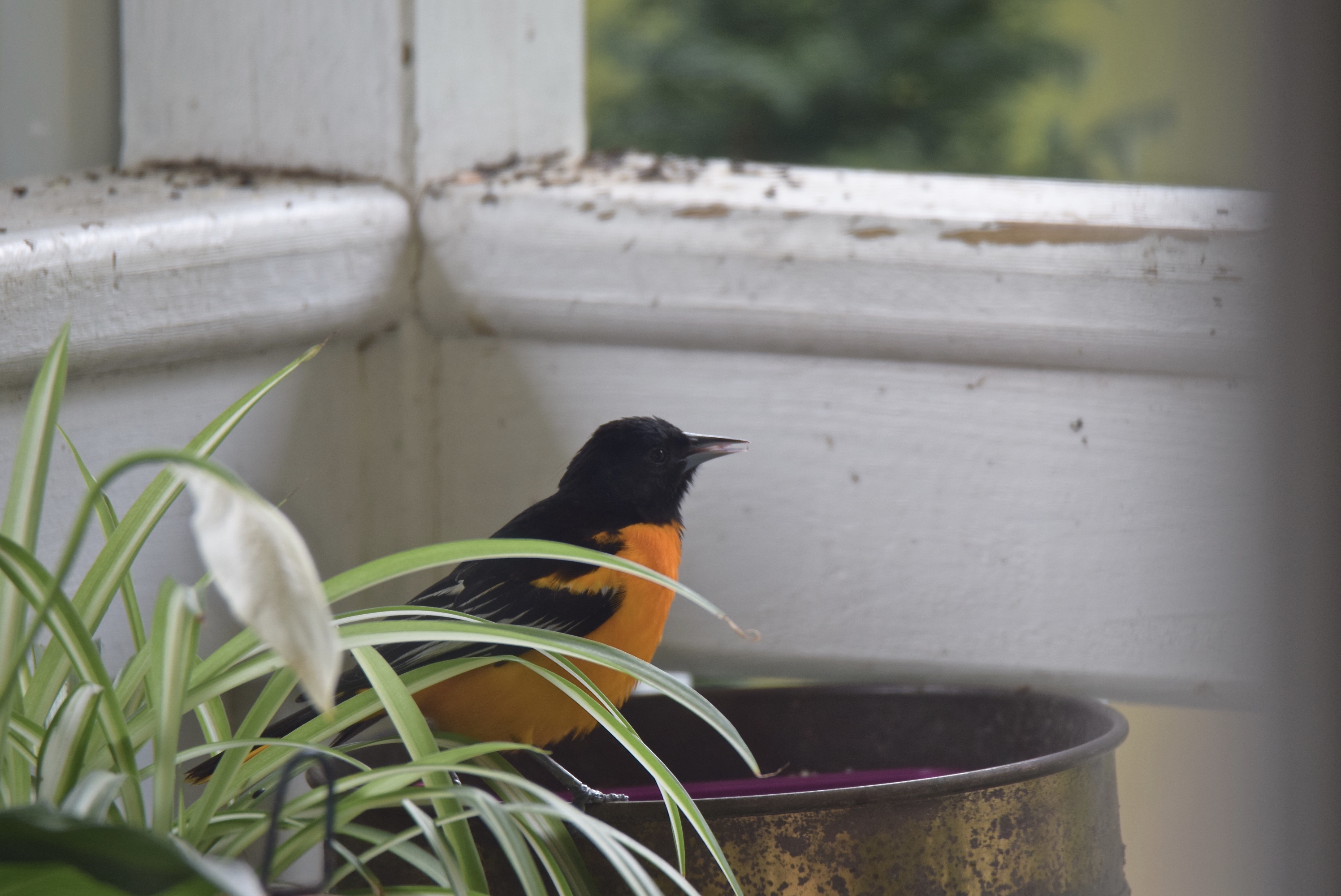 Last week I walked past the *up the road* neighbor’s house and she had a bunch of thoughtful birdfeeders, therefore she also had a bunch of happy birds, including (I counted) SIX baltimore orioles. As they don’t eat bird seed, I noticed she had a tray of jelly to tempt them for a visit. I love Baltimore Orioles, they are always a thrill to see with their bright orange feathers. I remember finding an oriole nest once, filled with fat baby birds. I remember taking a photo of a bald eagle and seeing an oriole in a branch above. I remember seeing an oriole in the sky, flying after another bird up the road, away from its nest. I’ve taken photos of them and it’s always a good bird day when I get to do that.