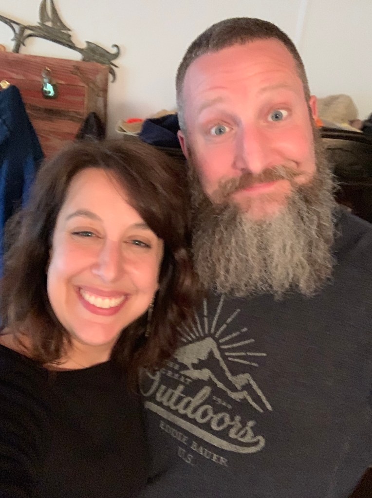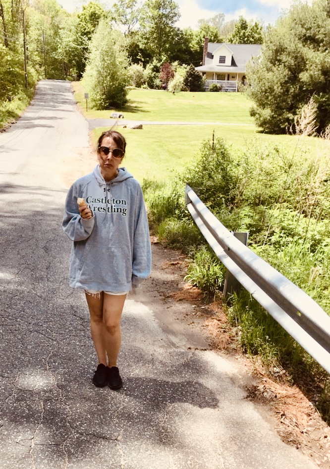 I’m holding an ice cream cone and wearing Rich’s sweatshirt. And new sunglasses.