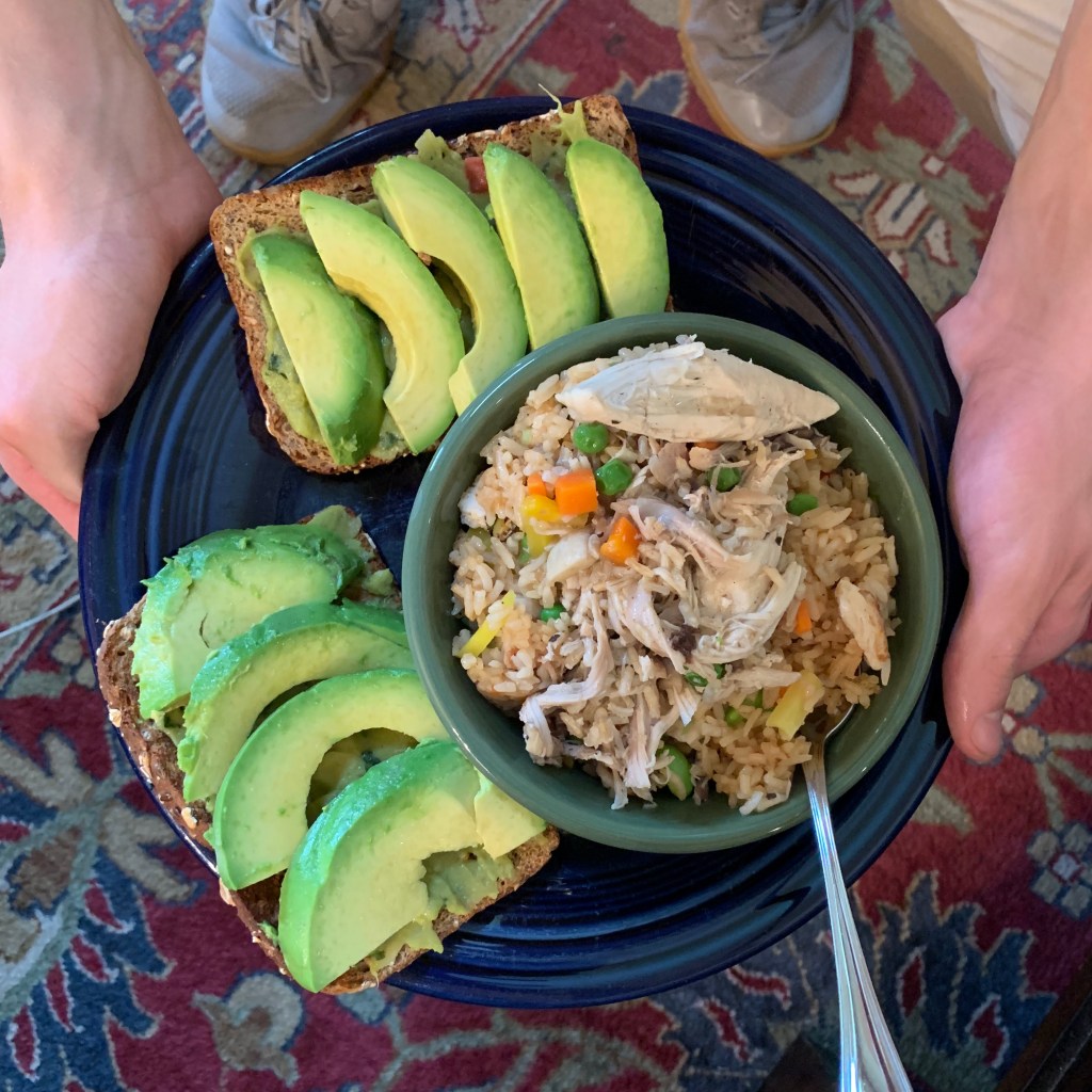 This was that chicken I was talking about in the last post. I ended up adding rice and veggies to it and everyone ate it. David also made avocado toast and came over to me so I could admire his plate.