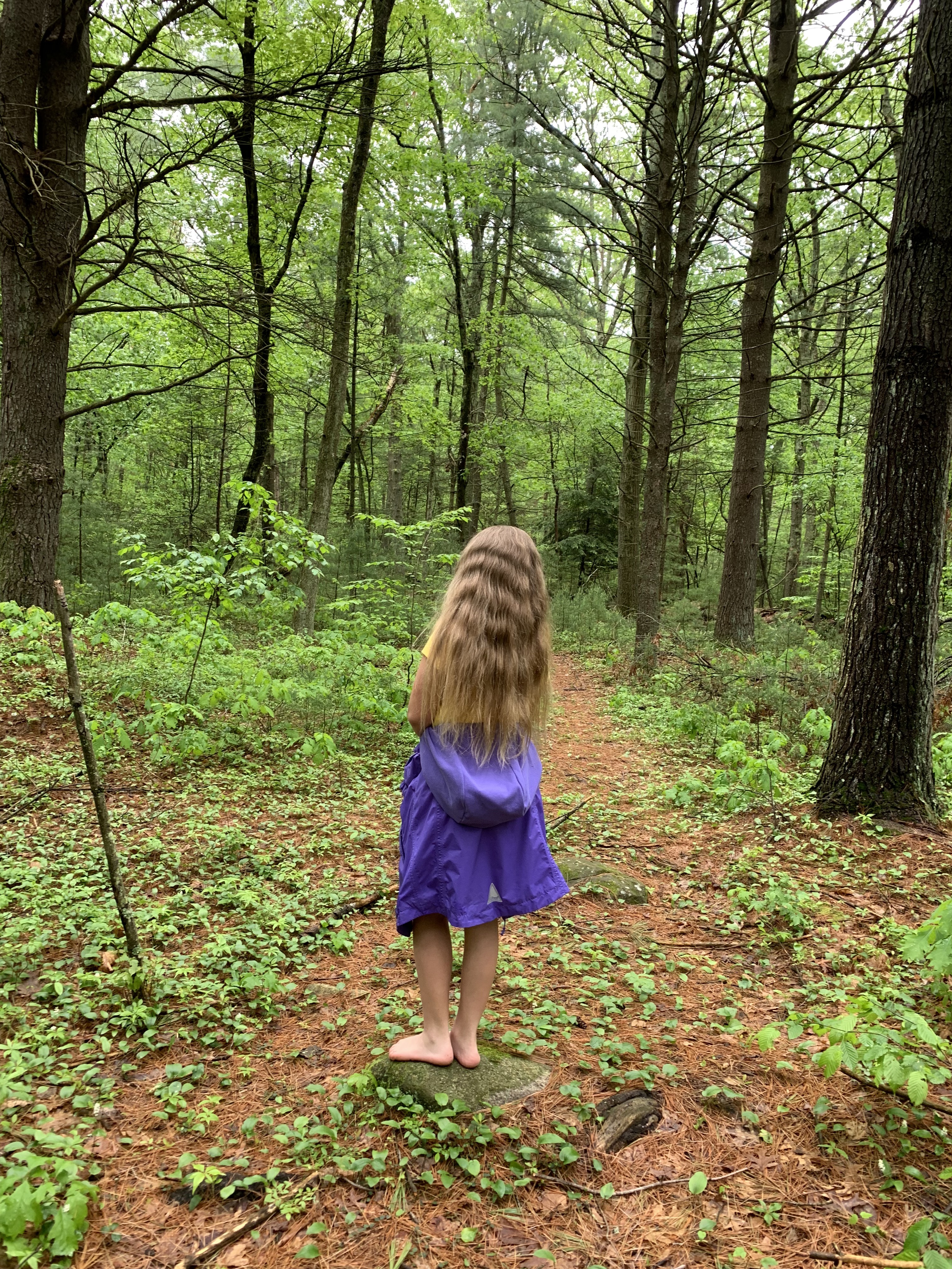 She’s had a nice day so far. She’s been playing with her little plastic cats that she loves so much. She drank delicious hot chocolate made with cinnamon and vanilla, served by her sister who says she’s “practicing for when she works in a coffee shop”. She ate homemade macaroni and cheese also made for her by her sister who knows how to make a great pot of comfort pasta. She went for a walk with Grace and me in the wet wet woods. It’s 58 degrees today and as cloudy as all get-out.