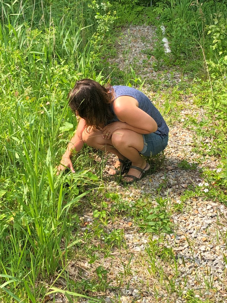 Rich took these two photos of me. The first is me looking at a bug when we were walking up at the dam. I was also checking on the wild roses and strawberries.