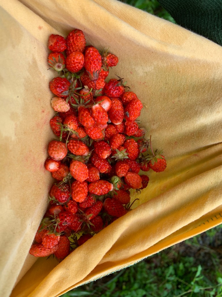 yummmmmmmmmmm warm muffins with freshly picked wild strawberries! I know where to find the berries and I like to think, as I pick, that the plants enjoy being harvested and will do even better next year. And I think it’s true!