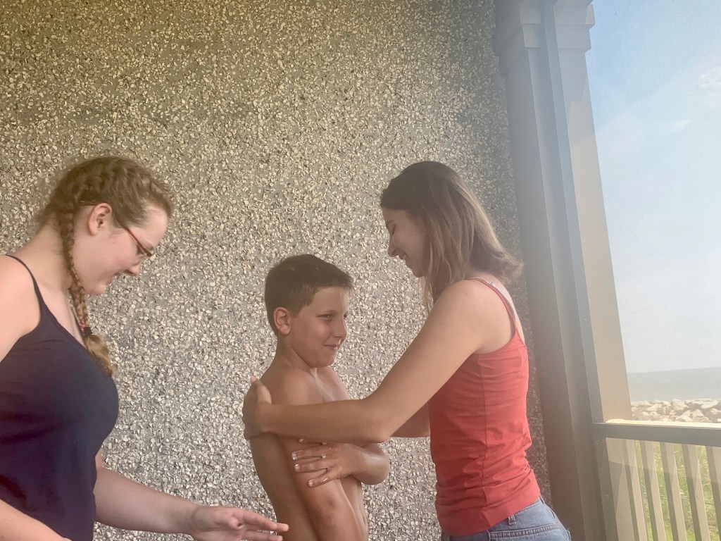 The wild-child came out to the porch with globs of white sunscreen just begging to be rubbed in, so, he was practically attacked by Brittnee and Grace who jumped right at him to help. He didn’t mind but seemed to have a hard time staying balanced as he was rubbed from all directions with four sisterly hands at once.