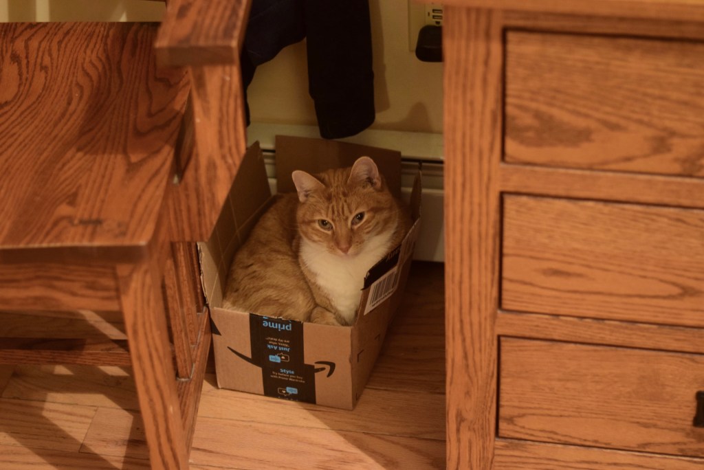 1. LOL. My cat does the same thing.Her latest small favorite box is a box on the floor under a table that is full of scrapbook paper strips. I was saving them to use on a future project,but now they are all smashed. 🙂 The paper strips were worth the sacrifice to see her curled up, and content.