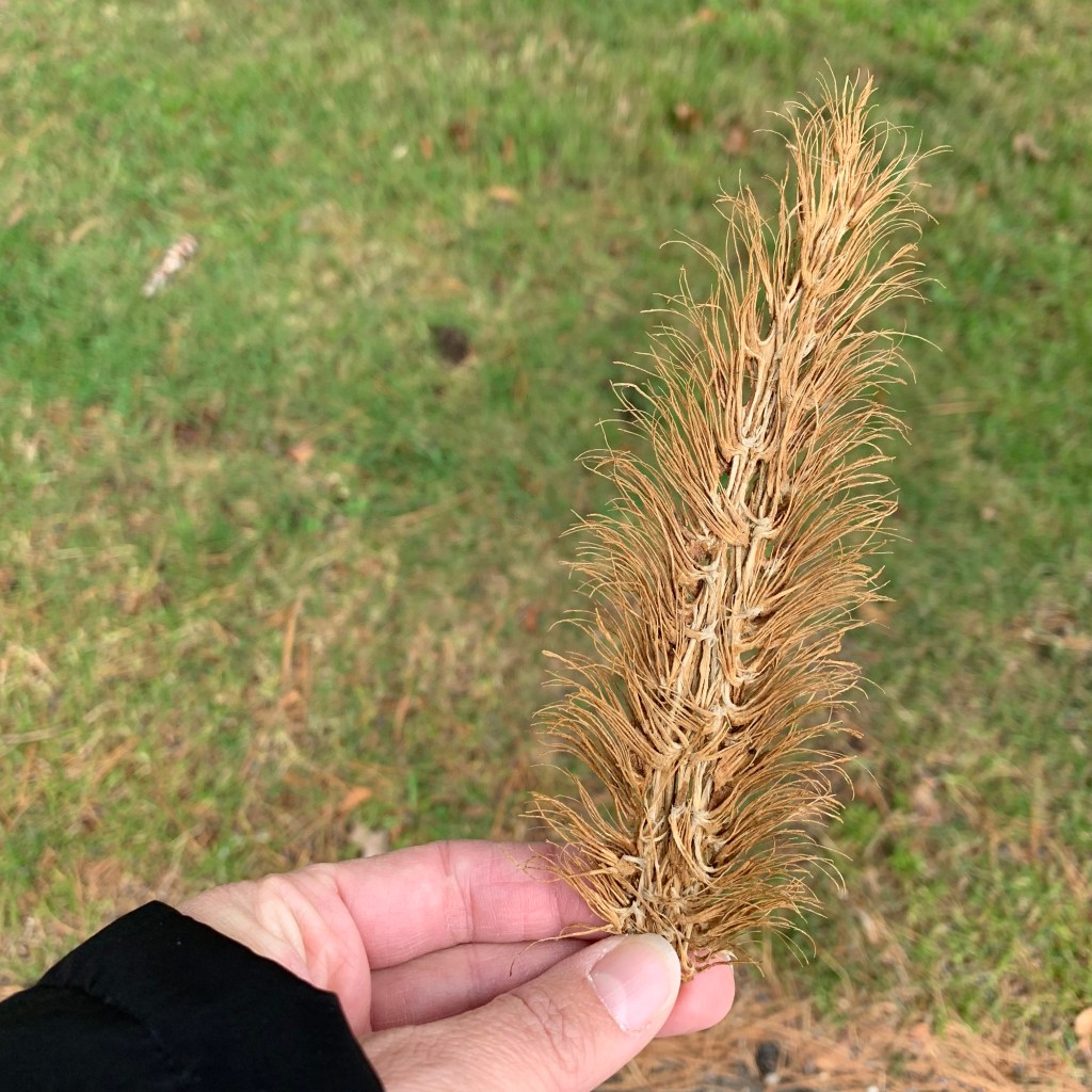 This is what a pinecone looks like after it has been in the road and frequently ran over with many tires. The children’s art teacher used them (representing Christmas trees) to glue on her homemade Christmas cards one year, and even decorated them with tiny sequins and glitter. So I always think of her when I see them. This is in my pocket, still, too.