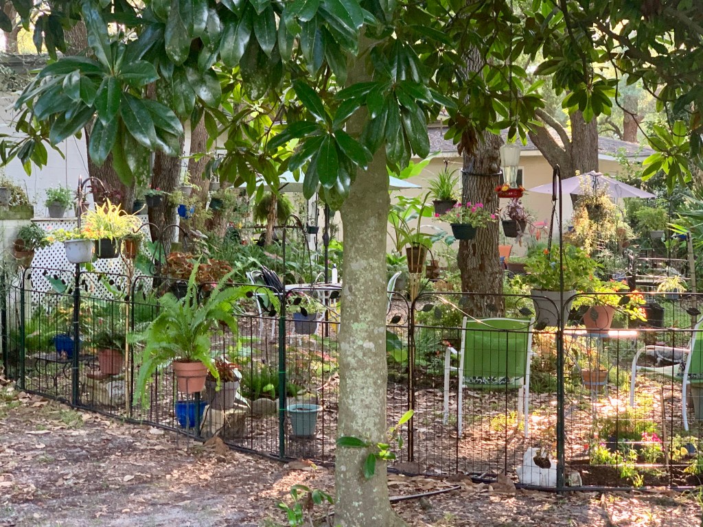 I wanted to blog in honor of this last day but there are so many photos that I’ve taken this summer and I really can’t decide which ones to share, so I thought I would just blog about yesterday, which began as most days do, with coffee in hand, and walking with my husband around our little neighborhood as he read out loud to me. After we were done, I decided to keep on going, and he went inside to work. The photo I posted is my favorite destination when I walk on the sidewalk (rather than the. beach). This house has the most amazingly enchanting garden taking up the entire front yard, and some of the side yards, too. I literally stop and gaze several times a week. The only person I have seen in the garden is a big middle aged man, usually smoking a cigarette, and a dog, too. There are potted plants everywhere you look, and garden tables and chairs. It is not so much what is there, it is the quantity of it all that makes a wondrous statement. I have a hard time keeping two hanging plates alive all summer, I marvel at the time it must take to keep all these plants watered in the southern heat of Georgia. However, there is plenty of shade in this garden, which is another thing I love, it’s sheltered by trees and plants, and on a corner of two streets. I JUST LOVE IT. I guess I would say this is the most inspirational real-life ordinary garden I’ve seen OTHER THAN MY PARENT’S gardens.