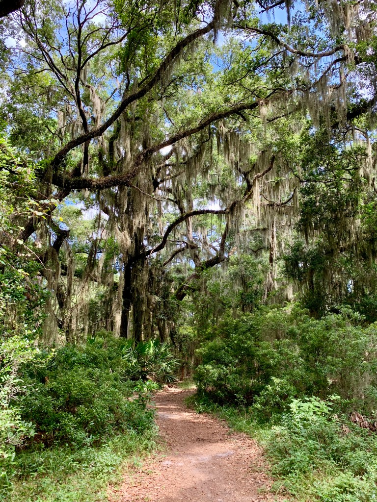 I was a little skittish while I walked the edge of the pond, imagining alligators coming at me with their teeth, but I saw nothing, and only heard a slight rustling in the bushes, which I imagine was made by a smaller creature like a lizard, maybe. I kept on going. The trees were so tall, with Spanish moss and vines draping through them so prettily. I had to slap mosquitoes off my bare arms and legs now and then, and I found a small white feather. I saw mushrooms but I saw no insects (only felt them bite me).